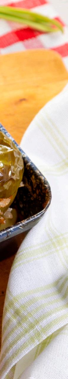 A zöldségeket egy nagy tepsibe sorakoztatjuk. A paprikákat és a paradicsomokat háromnegyedig töltjük a rizses keverékkel, visszatesszük a kalapjukat. A krumpligerezdeket a zöldségek közé rendezzük. A tetejét meglocsoljuk 2 ev!kanál olívaolajjal és 1,5 dl vízzel.