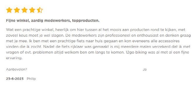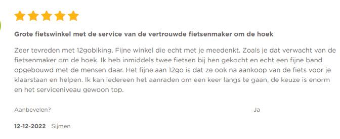 “De fiets is nu een week in mijn bezit, gekocht voor woon-werk verkeer (26km enkele reis) en het gaat perfect! Fijne fiets, robuust, ziet er mooi uit, schakelt licht, bereik is prima. Maandag met tegenwind kracht 5 naar mijn werk was goed te doen! In een iets lichtere versnelling op de sportstand echt goed vol te houden en op tijd op mijn werk ;-) Al met al blij met de fiets.”