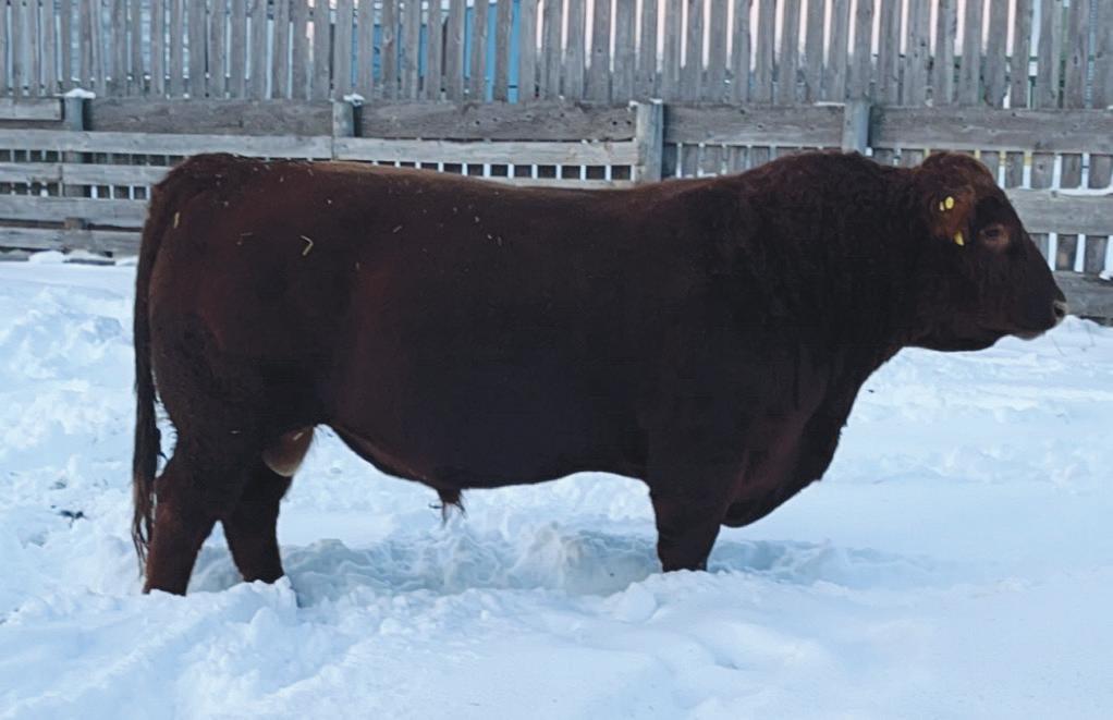 This year’s lead off bull is a good one. We purchased his dam from the MarMac dispersal in Brandon Manitoba. His long body and smooth front end should make him a calving ease sire, while still providing added pounds to his calves.