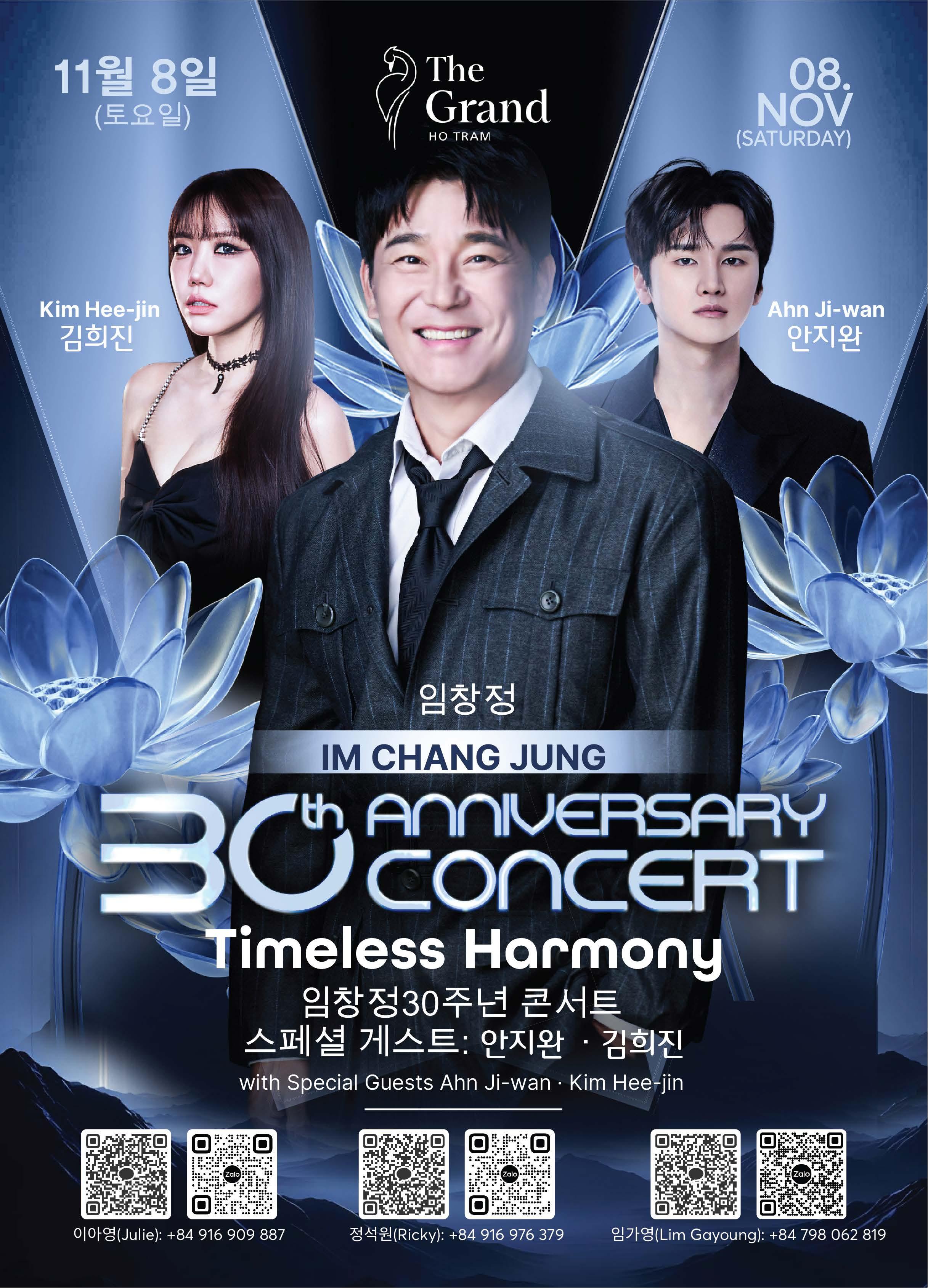 임창정 30주년 기념 콘서트 대한민국을 대표하는 감성 발라드 가수 임창정의 데 뷔 30주년 특별한 무대가 오는 2025년 11월 8일 토 요일, 호짬 THE GRAND HO TRAM에서 개최됩니 다. 수많은 명곡으로 세대를 아우른 그의 음악 여정을 되돌아보는 뜻깊은 자리가 될 것 같습니다.