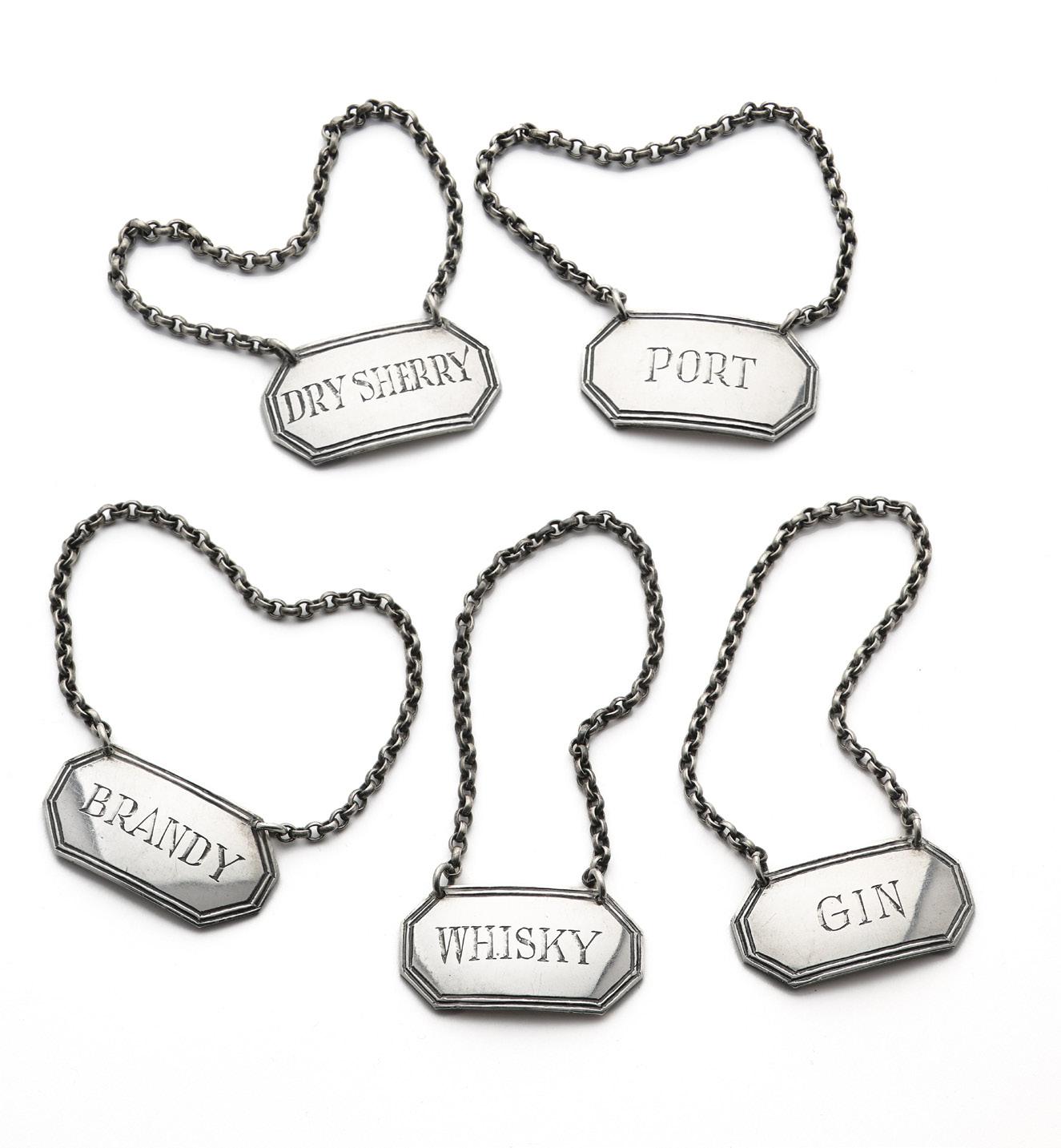 all with chains, the pair as openwork initials P and S for Port and Sherry, foliate engraved, Reily & Storer, London, 1857, the set of three as openwork curved cartouches for BRANDY, GIN and WHISKEY, Atkin Brothers, Sheffield, 1879 (5)