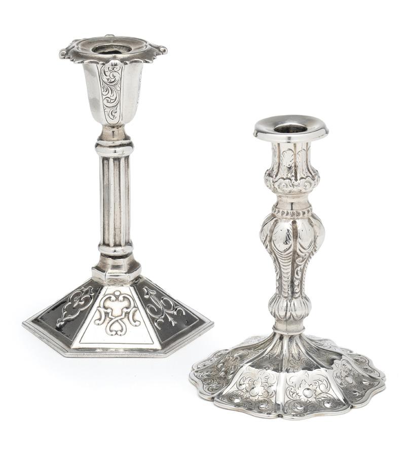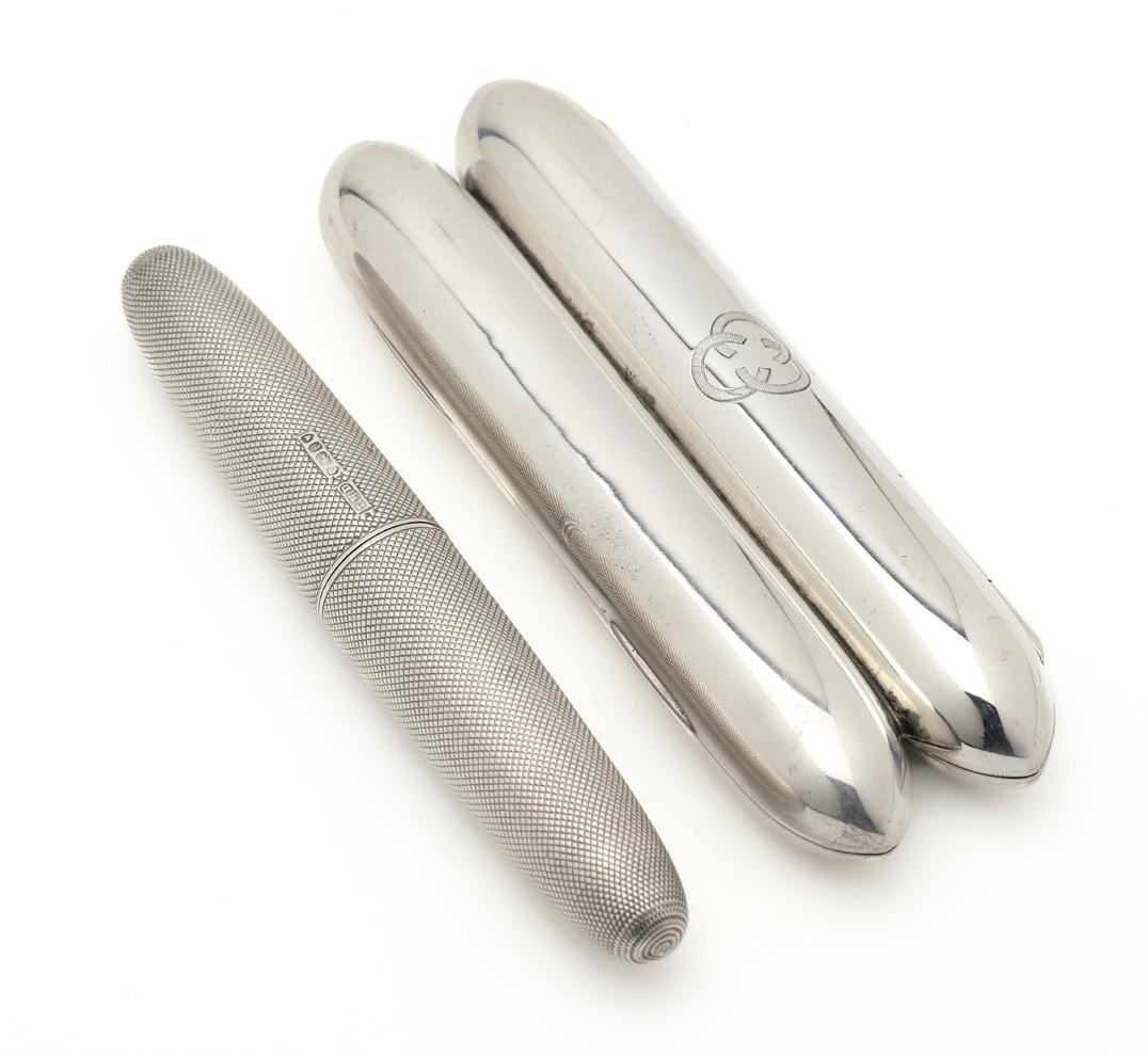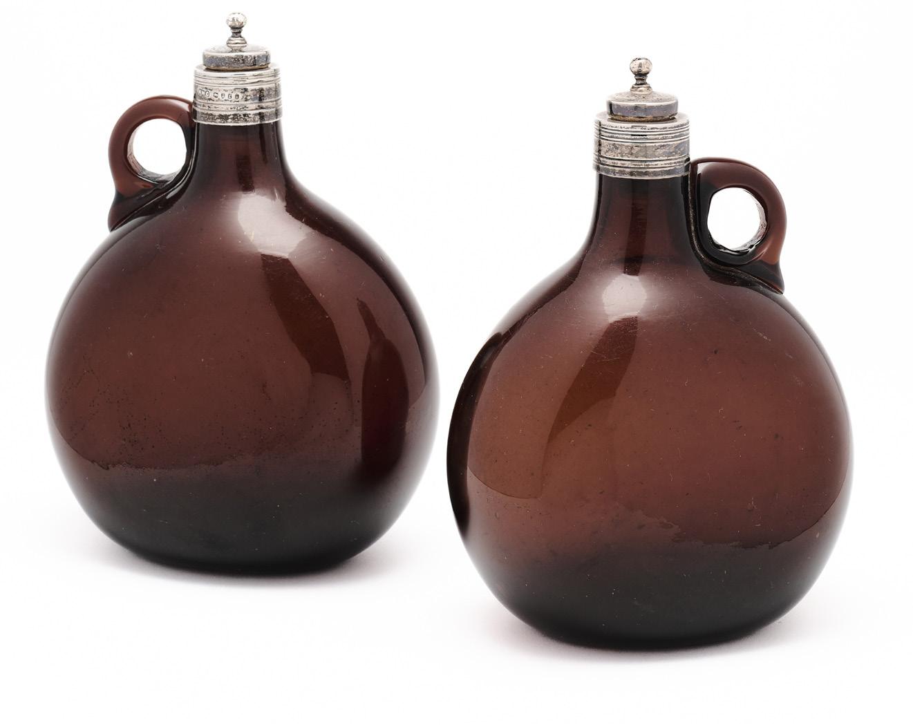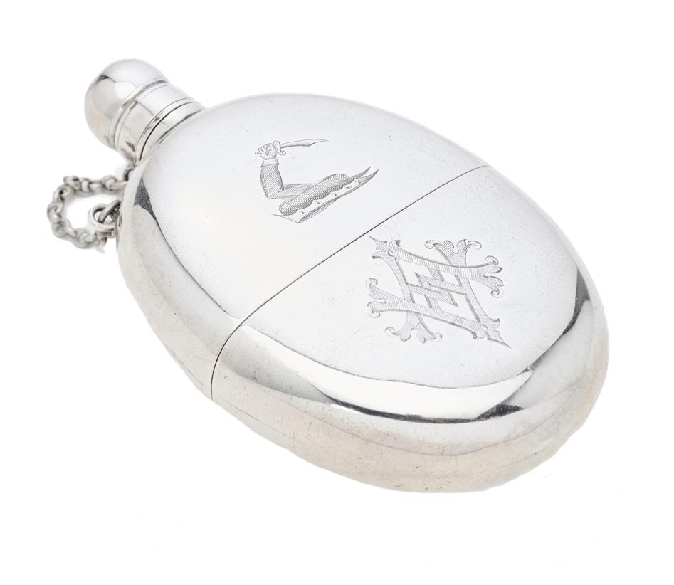 the pair hob cut flattened circular glass, with screw-on silver bun covers, George Brace, 1877, 11.5cm high, one as a double flask formed as a decagonally faceted glass cylinder with silver-gilt end mounts, one with a sprung cap, the other with screw cover, both engraved 'HVD' and 'May 2nd' or '1858', maker's mark indecipherable, 1858, 14cm long, the last as a Patent scent flask/dispenser, the faceted glass of flattened oval form, the screw-on mount with hinged cover, Thomas Johnson, 1871, 15cm long