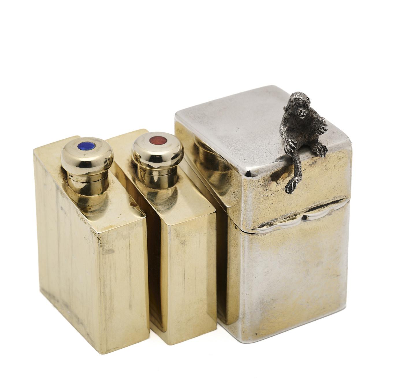 the rectangular box with traces of gilding, mounted with a cast figure of a seated monkey perched on the front edge, the gilt interior fitted with two rectangular removeable scent flasks with angled top sides with hinged lids enamelled with a roundel in red or blue above silver-gilt stoppers, retailer's inscription to inside front rim 'KENDALL & CO., 17, RUE DE LA PAIX. PARIS.', 7cm high, 123g