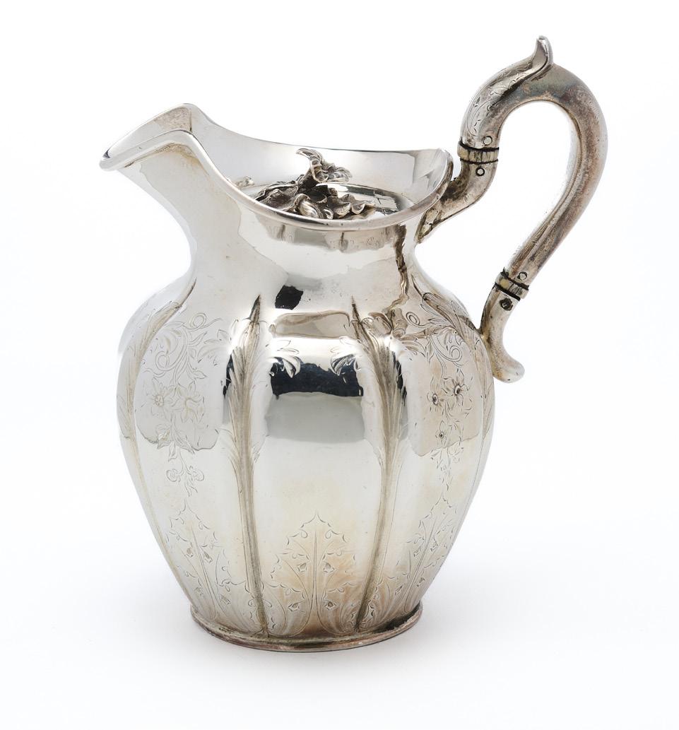A VICTORIAN SILVER SCENT FLASK, FRANCIS HIGGINS & SON, LONDON, 1888 flattened conical, decorated all over with roses on a matted ground, an oval initialled AM, the ribbed cap hinging to a glass liner interior with ground-glass stopper, 15.3cm long