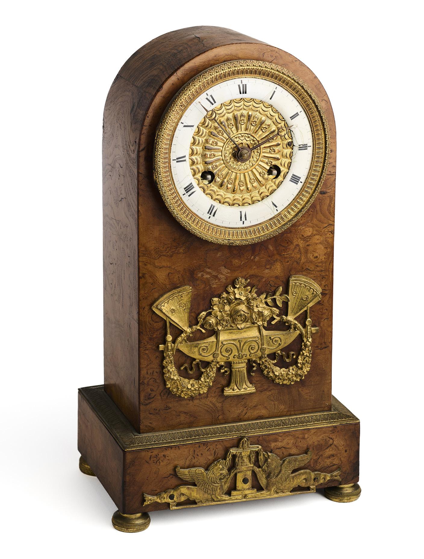 A RESTAURATION ORMOLU-MOUNTED BURR WOOD MANTEL CLOCK, PARIS, CIRCA 1840