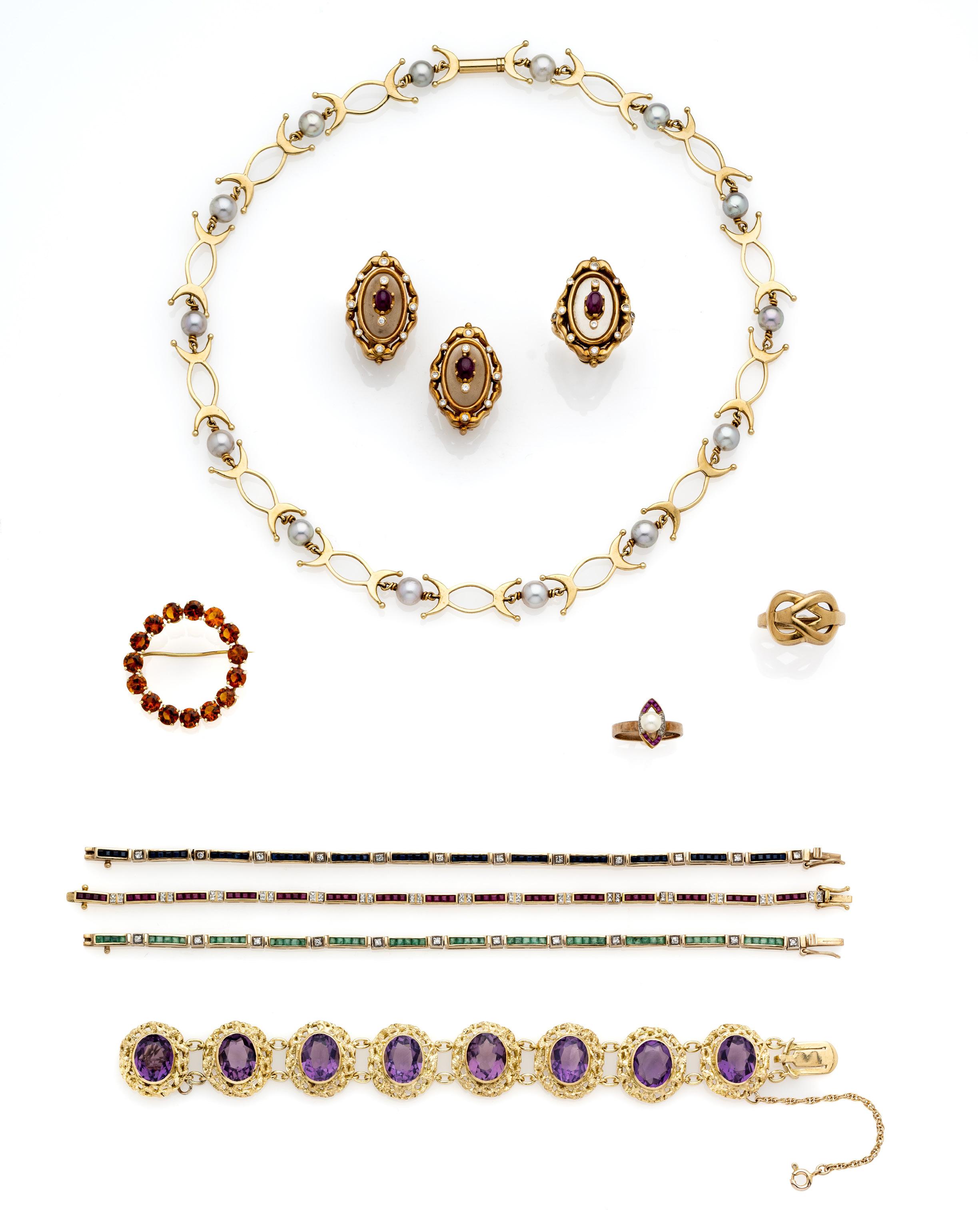 GEM-SET CLIP/BROOCH, 1960s, designed as a floral spray, set with mixed-cut multi-coloured gem-stones, including amethyst, citrine, garnet and peridot, dimensions approximately 80mm x 50mm
