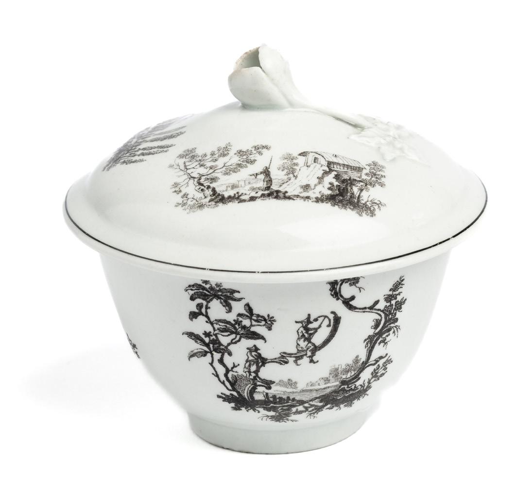 A WORCESTER SUGAR BOWL AND COVER, CIRCA 1756-60, printed in black with chinoiserie scenes probably designed by Robert Hancock (1730-1813) after Jean Pillement (1728-1808) of ‘Les Garçons Chinois’ and two of garden structures and figures, three further architectural vignettes to the domed cover with flower knop, 12cm diameter