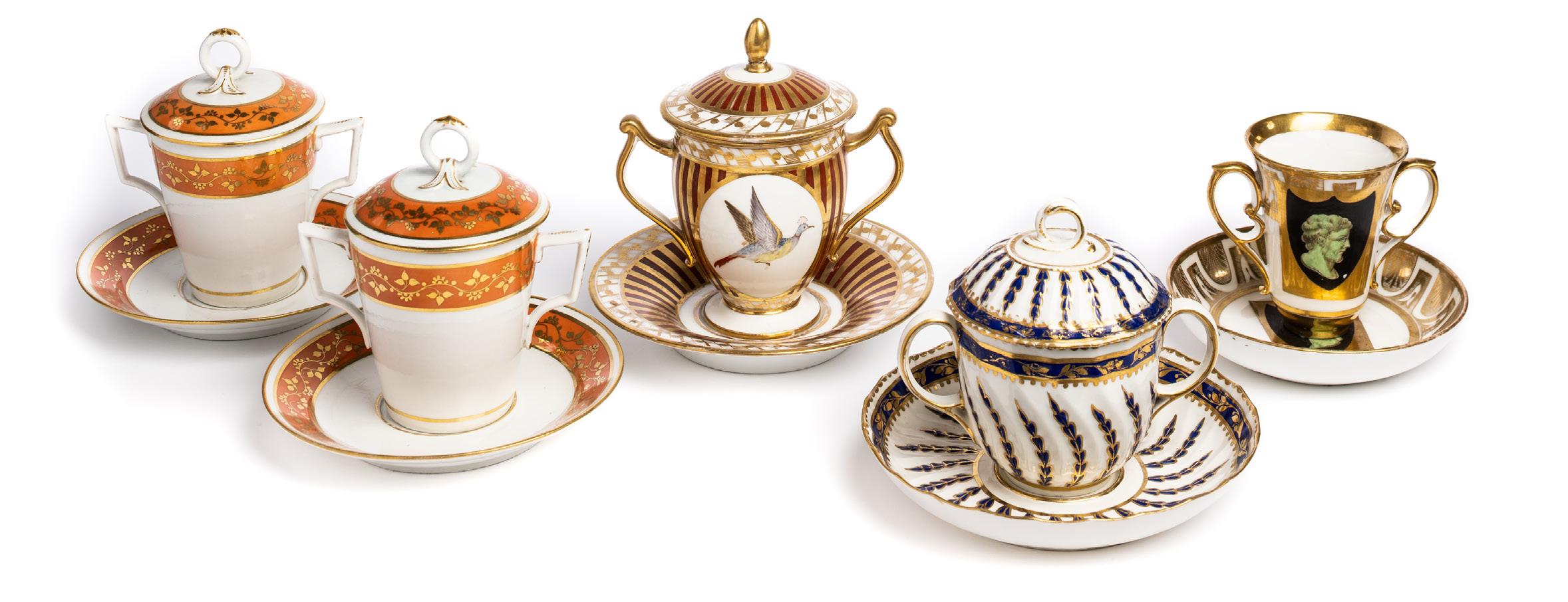 A GROUP OF FOUR CHOCOLATE CUPS, COVERS AND STANDS, CIRCA 1790-1805, comprising: a pair Flight and Barr Worcester with borders of gilt foliage on ‘Barr’s Orange’, incised B marks, 13.5cm high; one Derby example in ‘Smith’s Blue’ and gold, puce marks; and a Paris example probably decorated in the Thomas Baxter workshop with an exotic bird and an orange and gold striped ground; together with a Paris chocolate cup and saucer with green monochrome portraits (14)