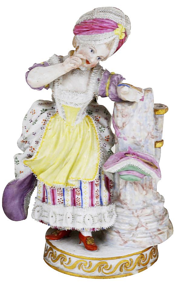 A MEISSEN FIGURE OF A GIRL, 19TH / 20TH CENTURY, modelled standing in 18th century costume about to fire an arrow, her left arm resting on a truncated column and supporting a basket full of arrows and her quiver, gilt scroll moulded circular base, underglaze blue crossed swords mark, incised J.32, impressed ‘40’ and ‘53’, 15cm high, repairs and losses