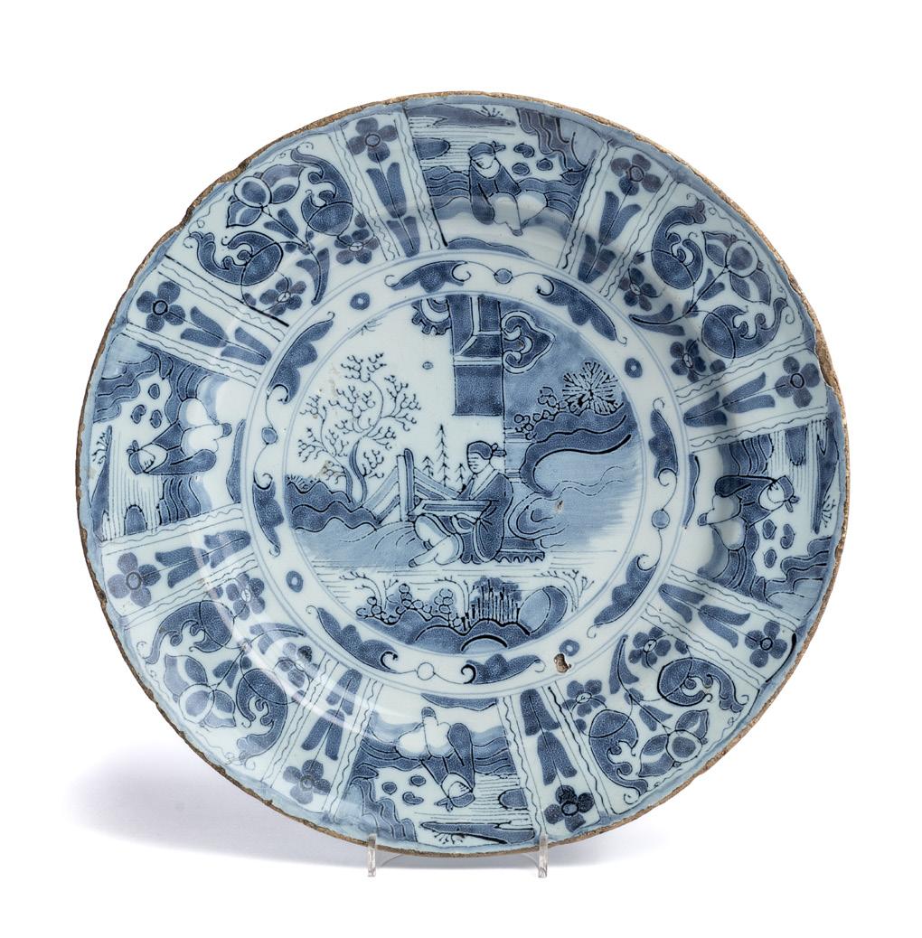 A DUTCH DELFT DISH, CIRCA 1700, blue and white Chinese style, painted with a seated figure in a garden, the border of alternating panels of flowers and further seated figures, 29cm diameter