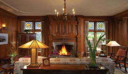 room, a hand carved fireplace with historic references of California, family crest, and historic coats of