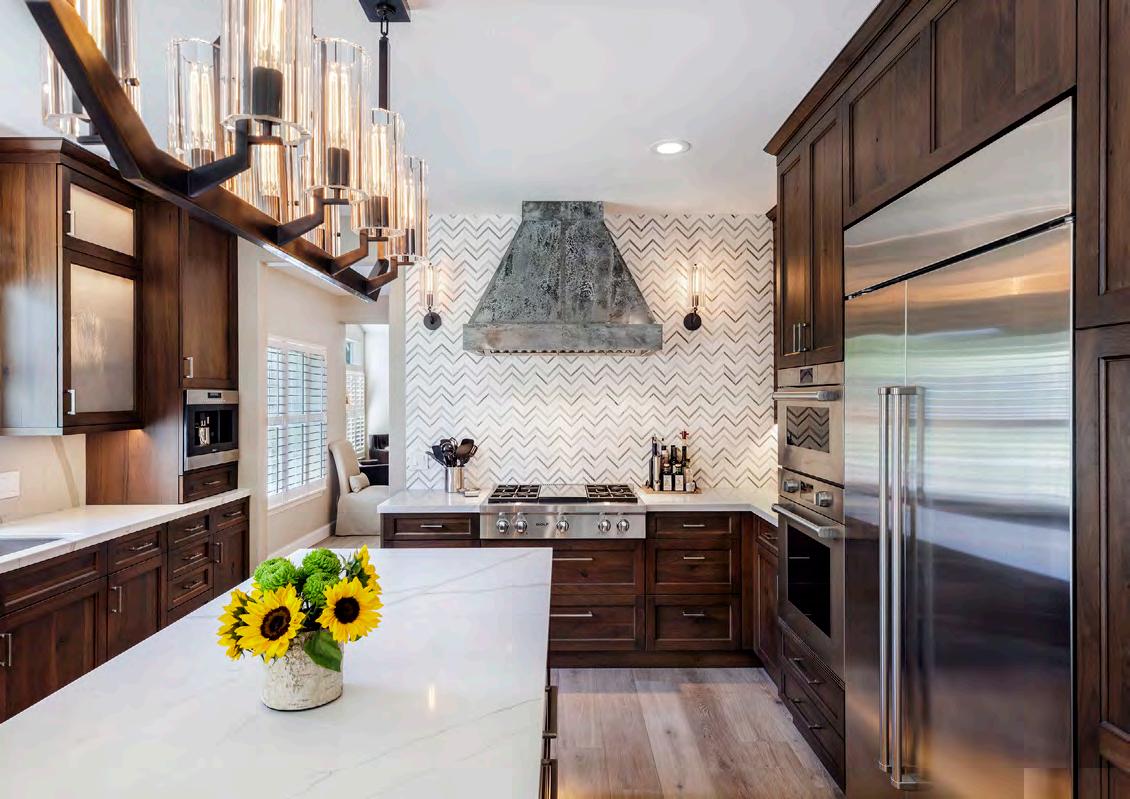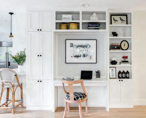 The team then reconfigured the main flo to incorporate all the must-haves on their cli ent’s wish list. Highlights include his and hers offic, a workout room, a great room, as well as a dedicated media room. They also moved a stairwell and relocated the kitchen from the back of the house to the front. “In the new kitchen you get these stunning views that can be enjoyed from either end of their massive island,” Miller says. Other kitchen luxuries: a walk-through pantry, Calacatto Oro Supreme marble counters and backsplash, and an ap