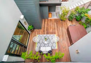 Besides removing several walls, they replaced a traditional staircase with a dra matic floating one and shrank the master bedroom to allow a proper powder room. “In the old layout, my guests would have to walk through the master bedroom to use the bathroom,” Zener notes. Other major changes included carving out a fourth bedroom from a workshop space and remodeling an existing bathroom.