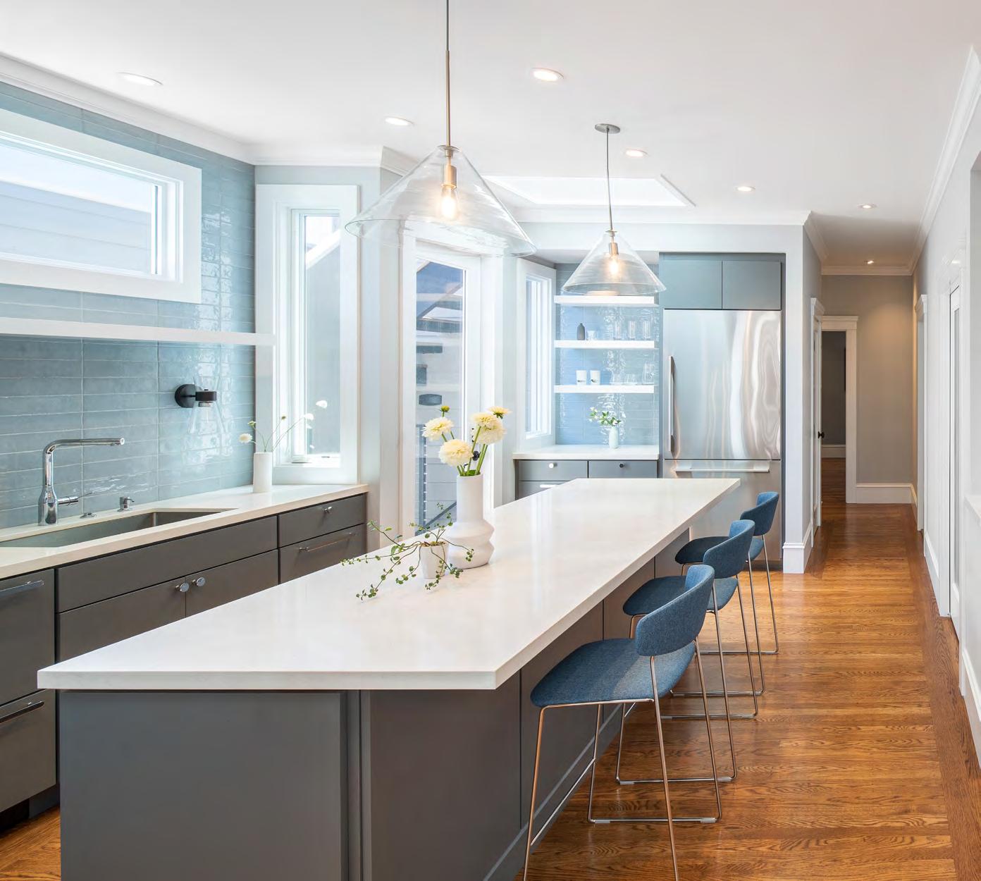 The couple purchased a steep, wooded, 1.5acre Kent field property with spectacular views of San Francisco, the bay and Mt. Tam, but the existing 1950s-era home on the site felt dated and didn’t fit their family’s needs. Morton’s sister, Momoko Morton Wong, principal designer and founder of Denver-based Momo Design, helped the couple assemble the team to rebuild the home to reflect their aesthetic and lifestyle — Emeryville-based Swatt | Miers Architects, contractor Kasten Builders and Huettl Landscape Architecture — along with contributing her own interior design exper tise. Helping the process run smoothly, Wong