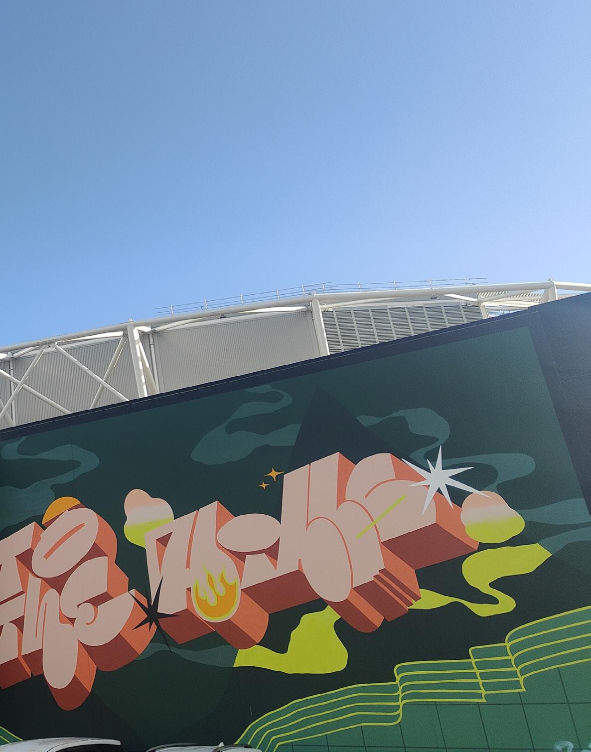 With the imposing One New Zealand Stadium at Te Kaha emerging above the city’s architecture, Tāmaki Makaurau-based, Ōtautahi-born and raised artist and designer Fluro’s I Look to the Hills is a timely reminder of a different, more established presence in the city’s skyline, and as such, a suggestion of our connection to place. Painted for the Flare Ōtautahi Street Art Festival earlier in 2025, the evocative mural serves as an acknowledgement of the artist’s roots, but also an invitation to consider and reflect upon our own attachment to the city and whenua. The work is bold, with funky typography and bright pastel and fluorescent colours popping against the dark forest green background. The combination of stylised text and elements of geometric design create an alluring image to draw the viewer into the poetic, almost mysterious phrasing, encouraging an echoed action of looking beyond the more immediate built environment to the iconic hills in the distance.