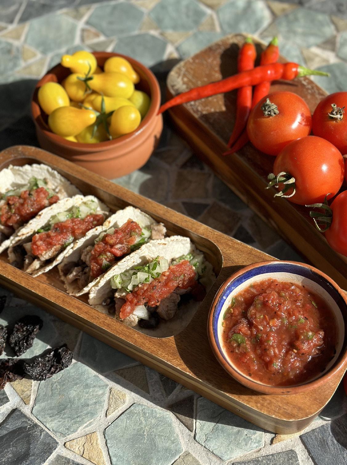 For the tortilla, mix four cups of Tio Pablo masa harina with just over two cups of warm water and a decent pinch of salt with your fingers. Form a dough. It should be quite sticky and able to form a ball. Rest for 20 mins in the bowl under a damp tea towel. Take a small ball of the mix (if crumbly, add a teaspoon of water and knead again, repeat until slightly sticky and not very crumbly). Between two pieces of baking paper, press in a tortilla press (or under a pot). Place into a hot, flat pan and as soon as there is any colour, flip it, and cook until lightly browned on each side. Remove and place in a stack under a clean tea towel. Flip the whole stack so you’re using the oldest ones first (they will be nice and soft).