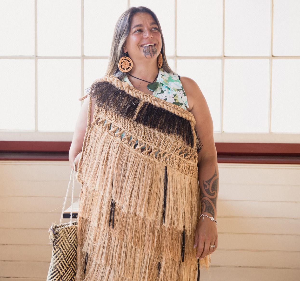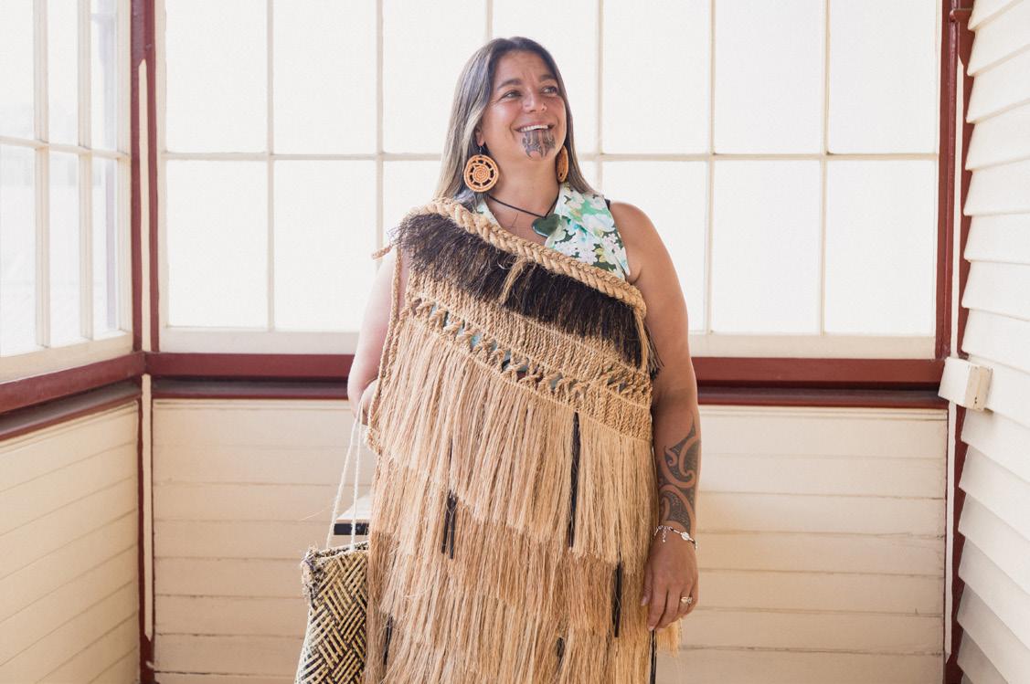 Artist Alice Spittle wearing the first kākahu she created in her class at Te Wānanga O Raukawa in 2001. Photo by Charlie Rose Jackson.