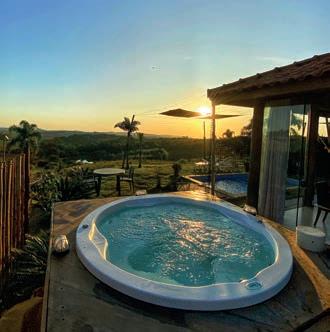 Por ali, as acomodações oferecem con forto e toques de cuidado aos hóspedes, e os espaços comuns contemplam piscina, empório para compras – já que o local não disponibiliza refeições – playground infantil, quadra de beach tennis e praia de campo para o lazer de toda a família. Destaque para o chalé master, que dispõe de piscina e jacuzzi exclusiva, jardim com espreguiçadeiras e mesa com cadeiras, ducha fria e espaço para fogueira, além de uma bonita vista para o vale onde o pôr do sol acontece, e uma varanda com redes de descanso. O lugar ainda tem sala de jantar, cozinha ame ricana completa, com refrigerador e