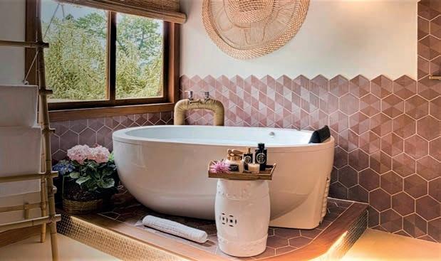 Banheira dos chalés do Embaúba Boutique Hotel e, à direita, piscina do hotel em Teresópolis
