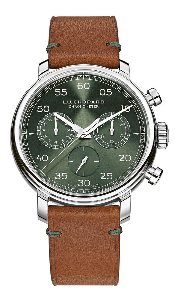 Silhouette en acier Lucent Steel © , visage radieux teinté d’un beau vert olive que survolent des aiguilles de forme dauphine fusée et mouvement de manufacture à remontage manuel : ce chronographe avec retour en vol L.U.C 1963 Heritage, doublement certifié, est la définition même du raffinement horloger.