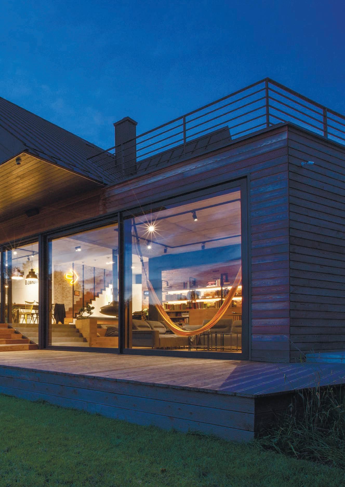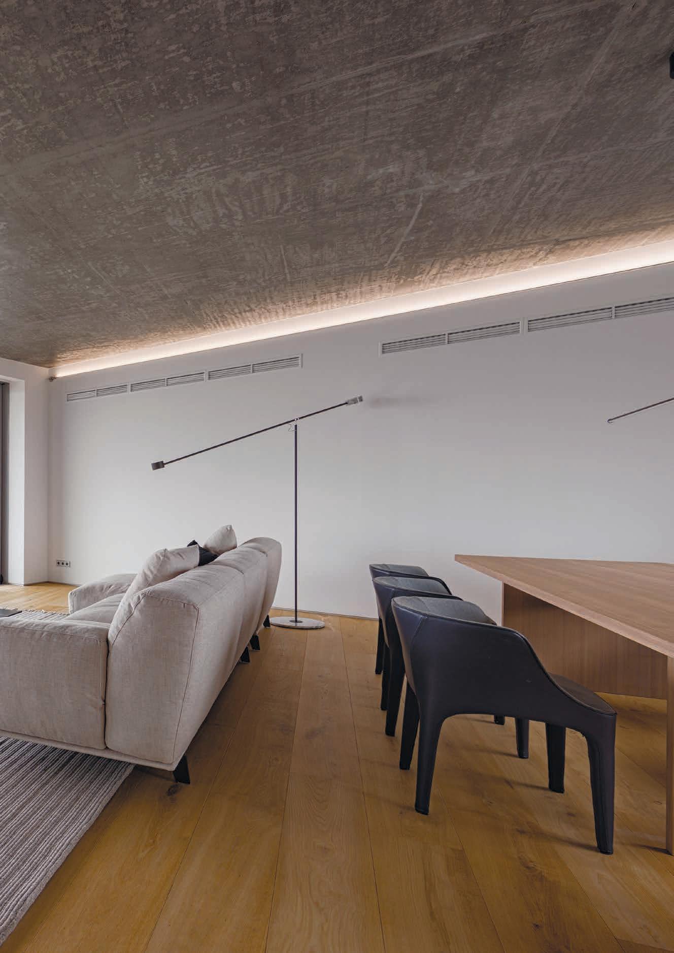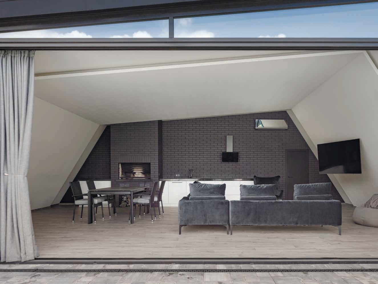 While working on the detailed design, we have established cooperation with Skyframe, special izing in frameless sliding window systems. At that time, Skyframe did not have such a wide glazing set - the living room had two sets con sisting of six sliding windows that parked in the wall niches and allow the living room to be opened completely from two sides. However, they liked our project very much and treated it as a design challenge. After six months, they created a completely new prototype motorized sliding system, which they personally commis sioned and programmed on site.