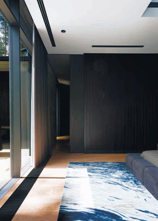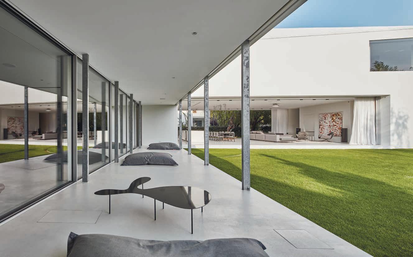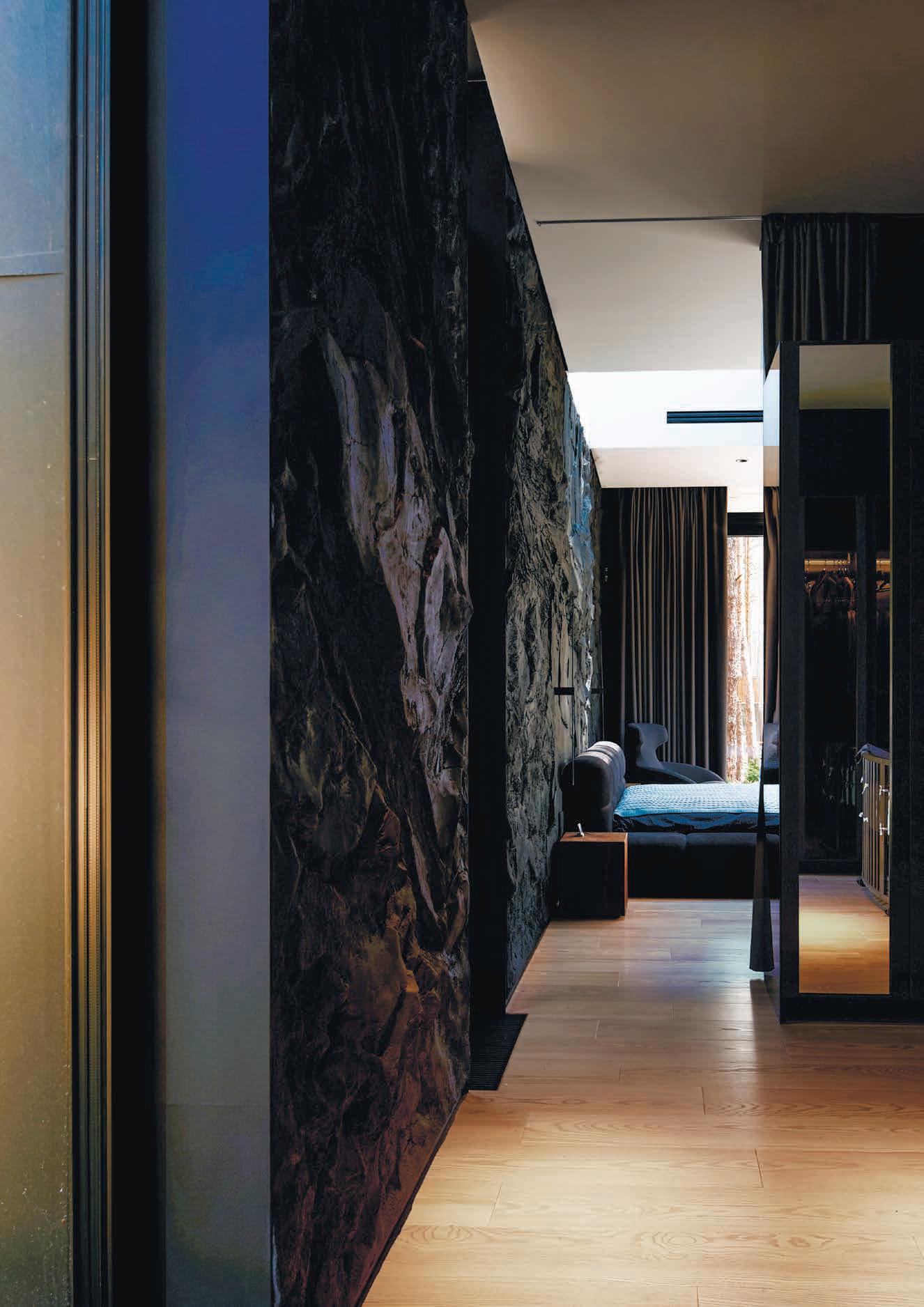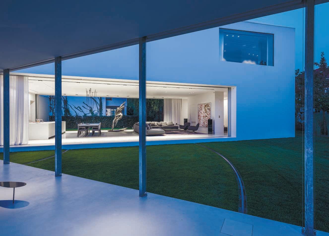 While working on the detailed design, we have established cooperation with Skyframe, special izing in frameless sliding window systems. At that time, Skyframe did not have such a wide glazing set - the living room had two sets con sisting of six sliding windows that parked in the wall niches and allow the living room to be opened completely from two sides. However, they liked our project very much and treated it as a design challenge. After six months, they created a completely new prototype motorized sliding system, which they personally commis sioned and programmed on site.