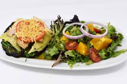 Marinated portabella mushroom is baked with chicken, roasted garlic, fresh spinach, artichoke hearts, fresh tomato and a touch of parmesan served with spinach, red onion and orange with balsamic vinegar drizzle. 14.29 No chicken upon request