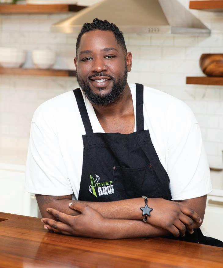 AQUI GREADINGTON has worn many hats in the food industry, whether working as a private chef, a cooking instructor or a caterer. You may have seen his name featured on the menu of a local chef’s dinner series, or maybe you’ve seen him at the Brookside farmers market demonstrating how to make jam with leftover summer tomatoes. His pop-ups sell out consistently—his most recent was at the Kinship Café, where biscuits were the theme. Classic biscuits and gravy were present, of course, but the chef wowed with his creative meal of Biscuits N’ Blueberries, a homemade biscuit layered with brown sugar cinnamon butter, brie and blueberry compote topped with a Chantilly cream and lemon zest. For Greadington, the goal is to not only serve