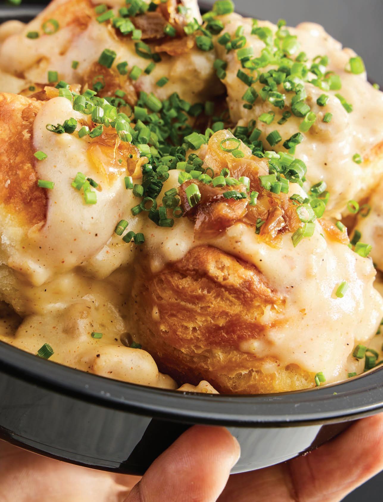 GRANTED, SNOOZE’S breakfast pot pie is not technically B&G, but the essence of the classic dish (a pastry topped with gravy) is still there. The Westport restaurant’s unique spin on the savory breakfast includes a flaky puff pastry bowl filled with house-made rosemary sausage gravy and topped with a sunnyside-up egg.
