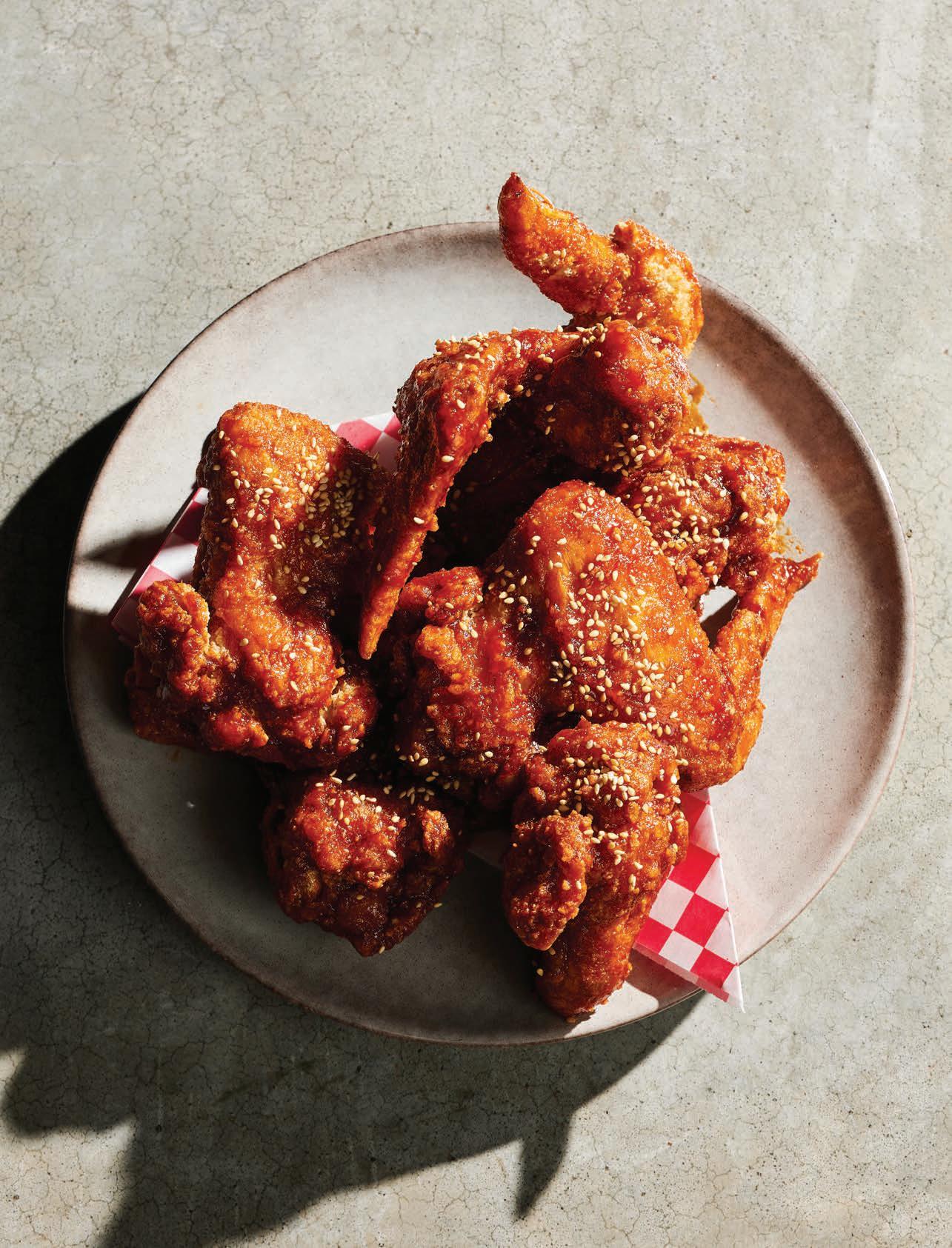 A plate with six massive chicken wings piled on top of one another was set at our table alongside a large clay bowl of sizzling bibimbap fixings whose depth seemed never-ending. We dug in, bumping chopsticks as we passed dishes from one side of the table to the other. The restaurant’s neon sign was the furthest thing from my mind, and my phone even remained in my purse. As the waves of dishes rolled in, a small feast gathered on our two-top. I was immersed. All forms of pleasantries went out the window as we became enraptured by the gorgeous funk of kimchi, tore away at juicy slices of beef short rib with our teeth and ferally bit into ungodly sized Korean fried chicken wings.