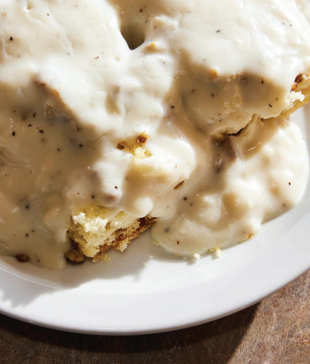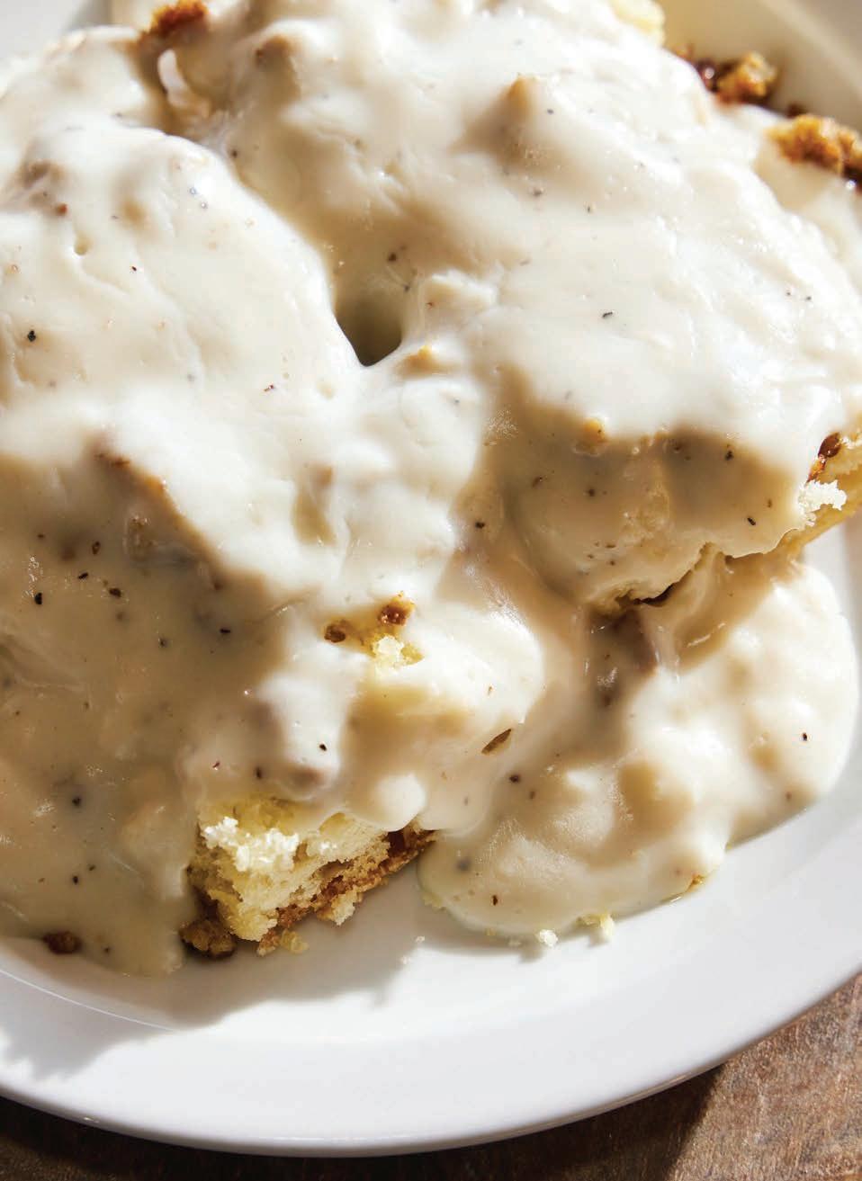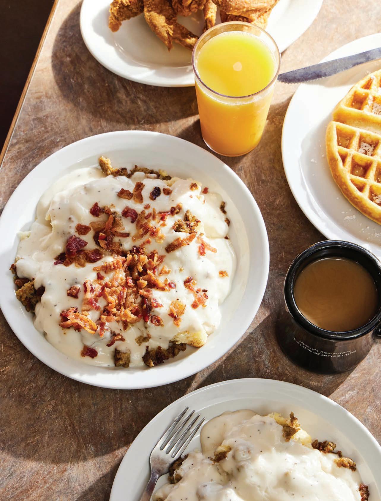THIS CROSSROADS RESTAURANT offers an impressive brunch menu filled with delights such as fried oysters and chicken and waffles. But the biscuits and gravy stand out thanks to their pillowy biscuits with glazed tops that have a taste reminiscent of sweet corn bread. The gravy is bright, and the dish shines with the garnish of chopped chives.