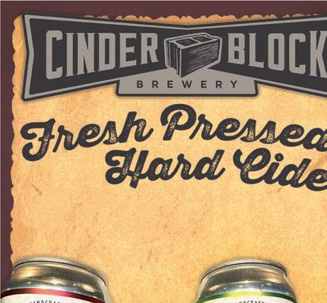 Cinder Block cider cans have o cially hit the market. For those of you familiar with their French and English ciders, these products have been repackaged into the new Fresh Pressed line that is now available year-round at local retailers. Made from fresh, local apples, Fresh Pressed hard cider is available in two flavors. If you’re a fan of dry cider, the Apple Cider delivers a semi-dry and pleasantly crisp taste. For a slightly sweeter flavor, the Cherry Cider o ers a semi-sweet, lightly tart finish. Keep an eye out for seasonal cider releases in addition to these two mainstays!