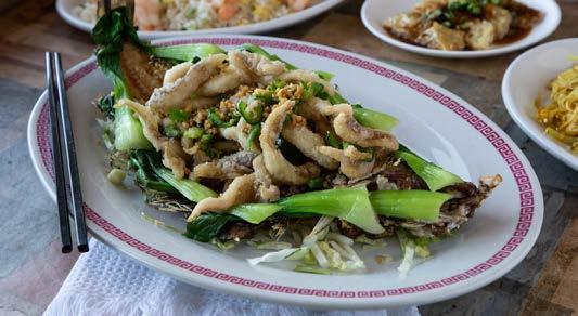 An entire flounder is filleted, and then the meat is sliced into bite-size pieces. The fish’s bones are then deep fried. The meat is also deep fried with jalapeno, garlic and scallions and then served on top of the fried bones—mostly for presentation purposes, though some customers do eat the bones, Lam says.