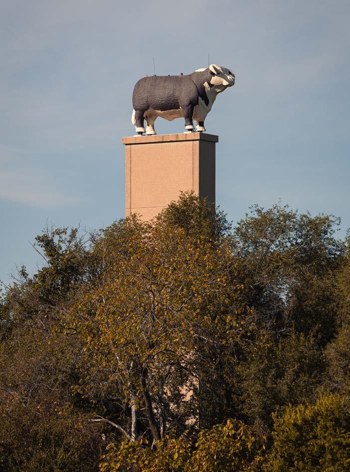 WHEN DRIVING ALONG 12TH STREET near the I-35 exit, drivers might spy something a bit unusual peaking through the west foliage—a giant Hereford bull.