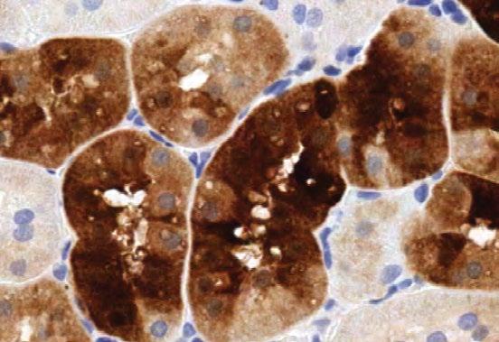Fig. 1: (Left) PEG immunoreactivity in kidney from rats given 100 mg/kg 10kPEG IV. There is variable but diffuse PEG staining in tubular epithelial cells throughout the renal cortex. PEG staining is not associated with epithelial cell vacuolation (Magnification 230x).
