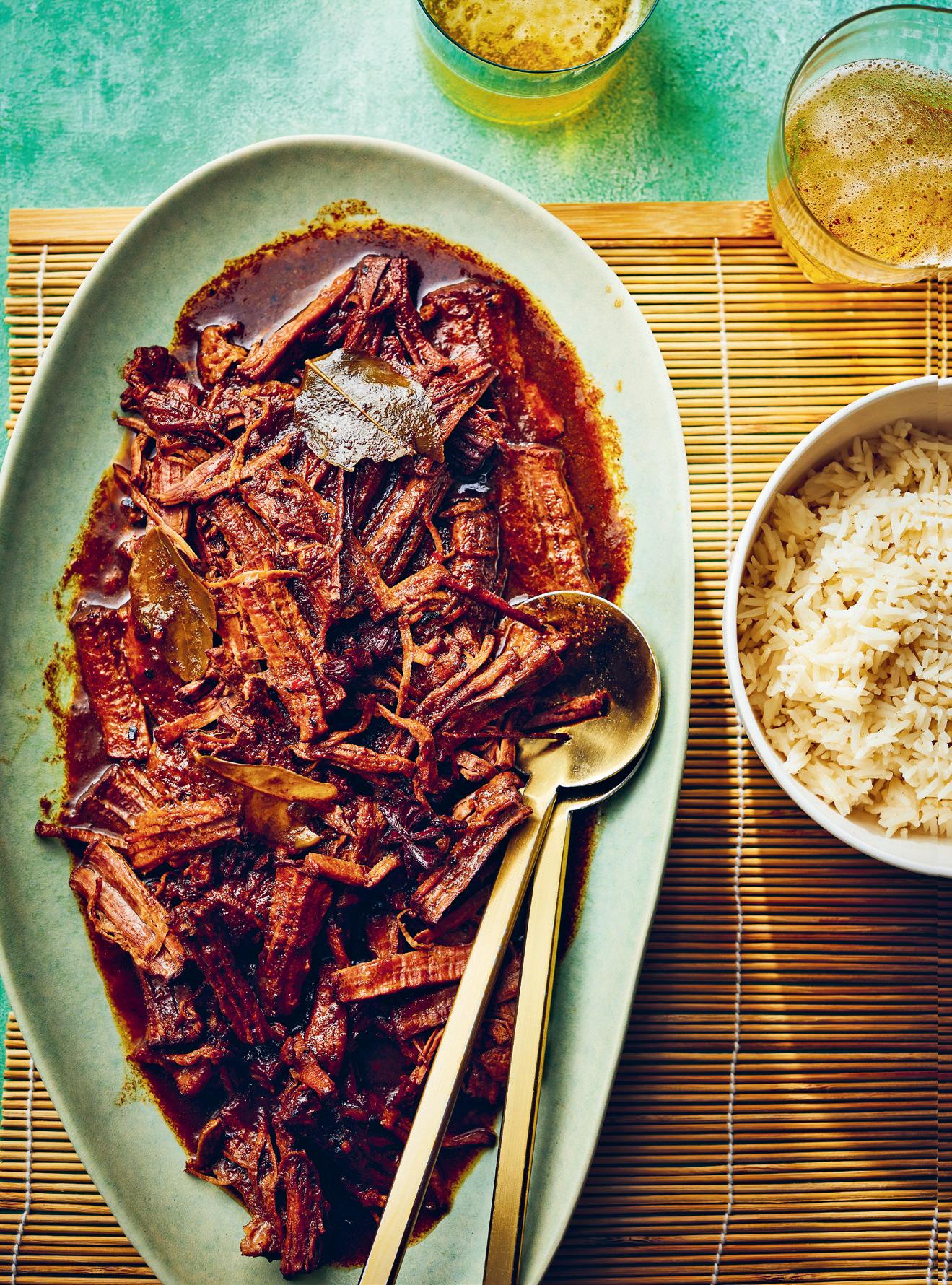 Add the lime leaves and gently stir in, then cover with a lid and allow to cook for 11/2 hours, stirring occasionally. After 11/2 hours the meat should be tender and falling apart and the sauce will be thick and sticky. If the sauce is still a little thin, remove the lid and continue to cook, stirring occasionally, until the sauce is reduced and any excess liquid is practically dried up. Serve on top of fluffy steamed rice.