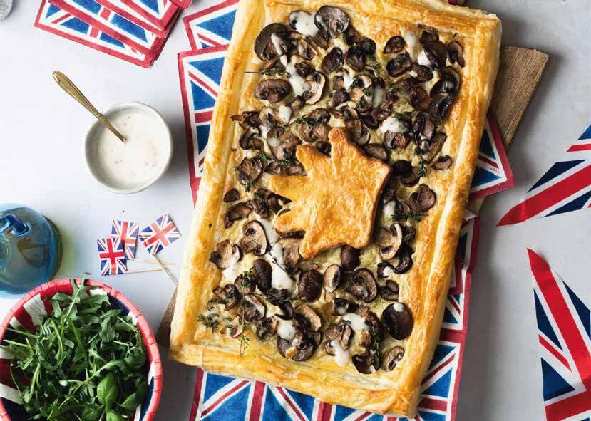 Unroll the pastry and score a ½ inch border around the sheet. Pile the grated cheese followed by the mushrooms into the centre. Cut out a crown shape from the second puff pastry roll. Carefully place the puff pastry crown on the top of the tart.