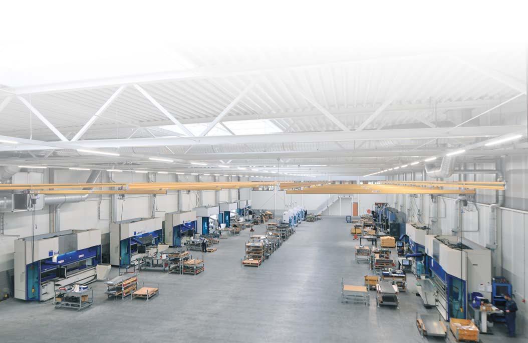 delijk aan 270 medewerkers werk bieden. Gefaseerd zullen hier zestien lasersnijmachines, tien buislasers en zestien kantbanken worden geïnstal leerd. De interne logistieke processen worden uitgevoerd door AGV’s (auto mated guided vehicles) die het plaaten buismateriaal automatisch naar de draagarm van de lasersnijmachines