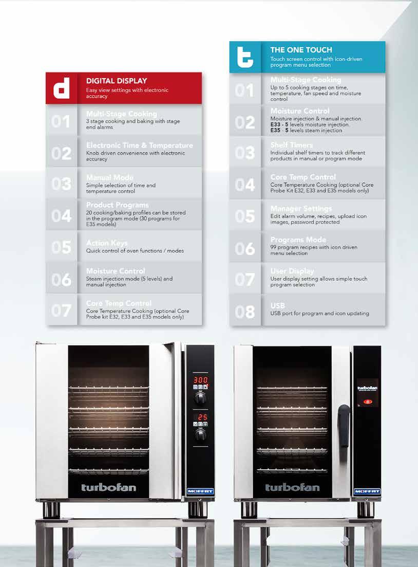 The best performing ideas in the Turbofan range have been redesigned, redeveloped and reborn as a durable new series of convection ovens designed for ease of use, increased application and future-proof durability. Each product in the series carries Turbofan performance and durability in its DNA. The Turbofan Series looks superior and this impression is fully supported by an array of new features.