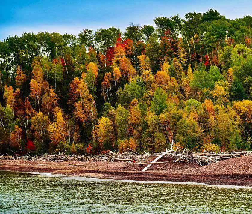 wind through crimson-tinged woods to secluded beaches where Superior’s waves crash under the watch of towering maples and oaks. It’s the perfect place to pause and soak in the peaceful rhythm of fall.