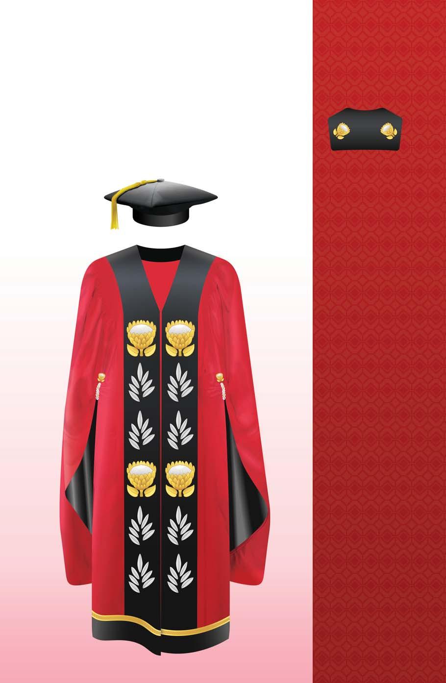Black, edged with symbolic print in the Faculty colour and trimmed on the cowl with cord in gold colour; the neckband emblazoned with the protea in the Faculty colour.