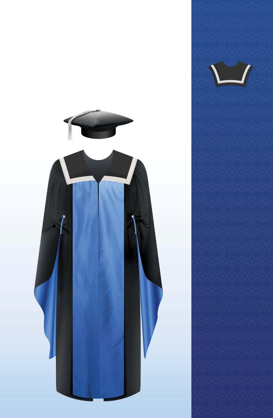 Black, edged with symbolic print in the Faculty colour and trimmed on the cowl with cord in platinum colour; the neckband emblazoned with the protea in the Faculty colour.