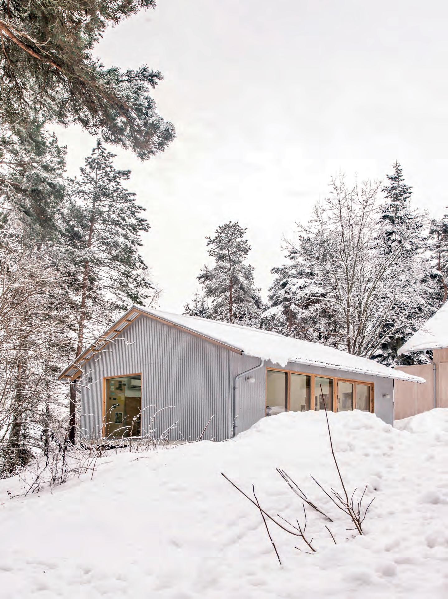 A antiga construção foi revestida com gesso no interior e chapas de alumínio corrugado no exterior, dando ao edifício uma aparência fresca e um carácter espacial.