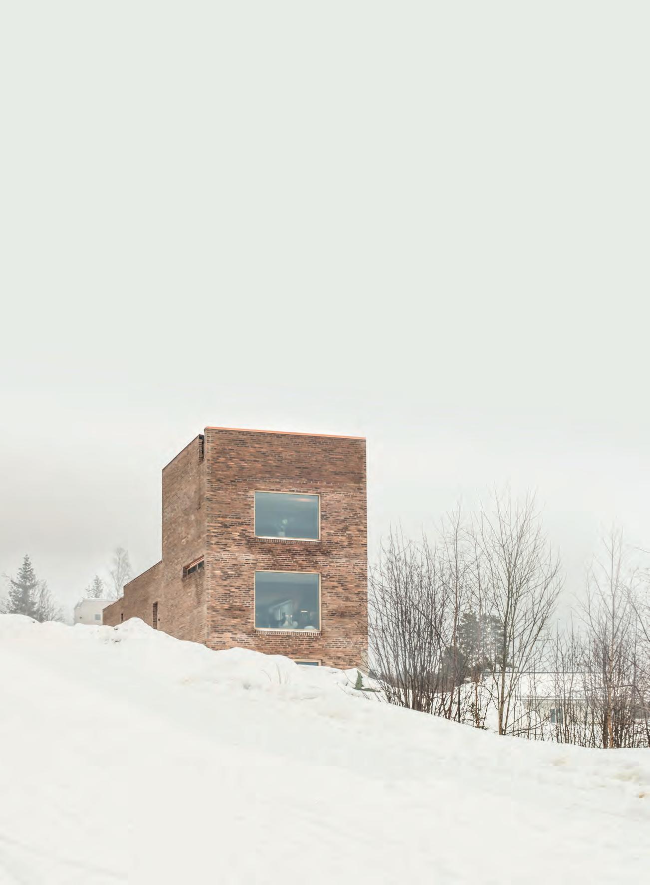 Ao longo da história, a área ao redor do lago Mjøsa tem longas tradições em alvenaria. Foi o lar de 25 olarias e tanto a estação ferroviária quanto a igreja em Lillehammer são feitas de tijolo. O tijolo é um material duradouro com peso e carácter que lhe conferem uma qualidade intemporal. Hoje, é geralmente usado como revestimento sem propriedades estruturais. O nosso interesse era encontrar uma forma de