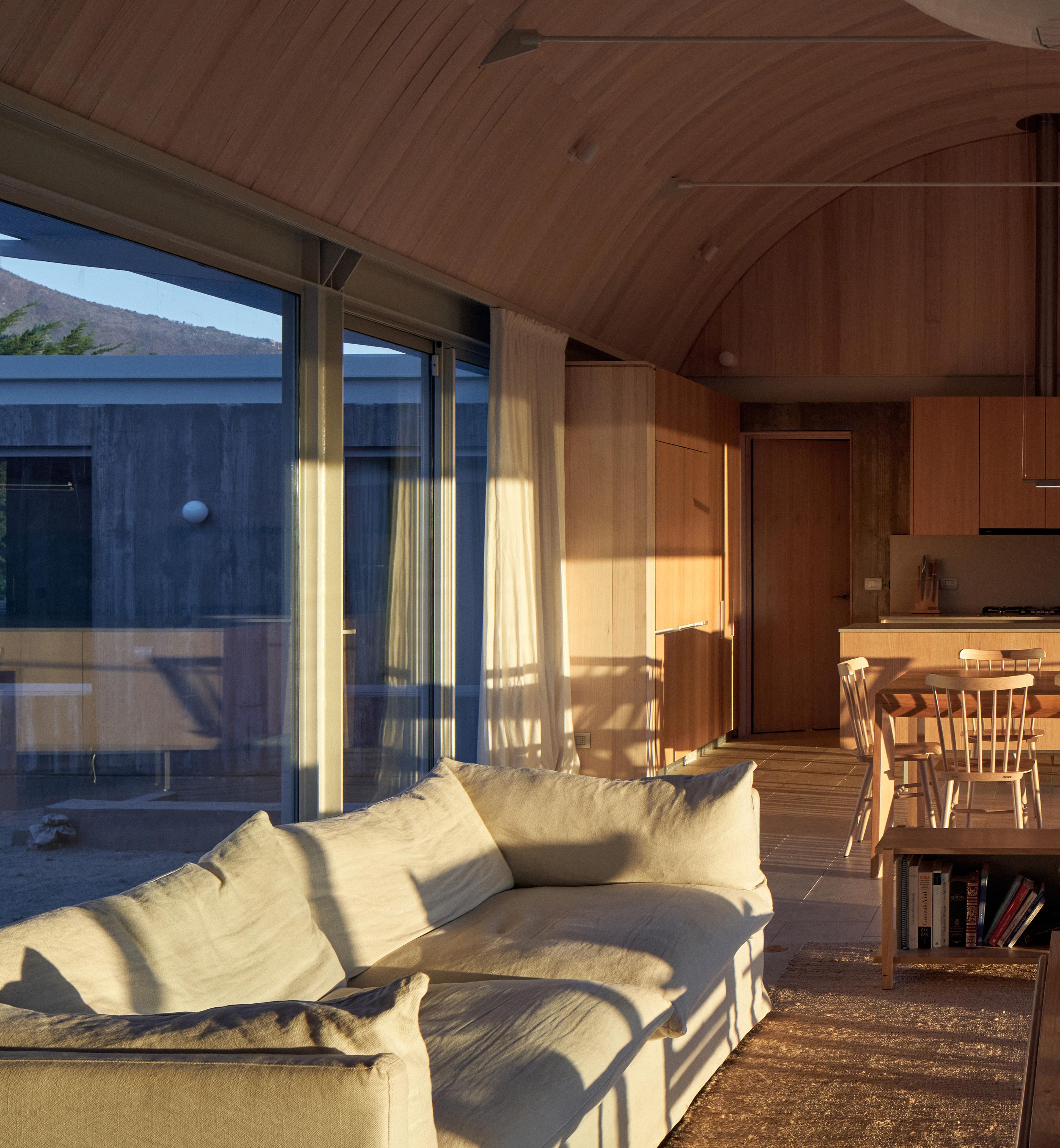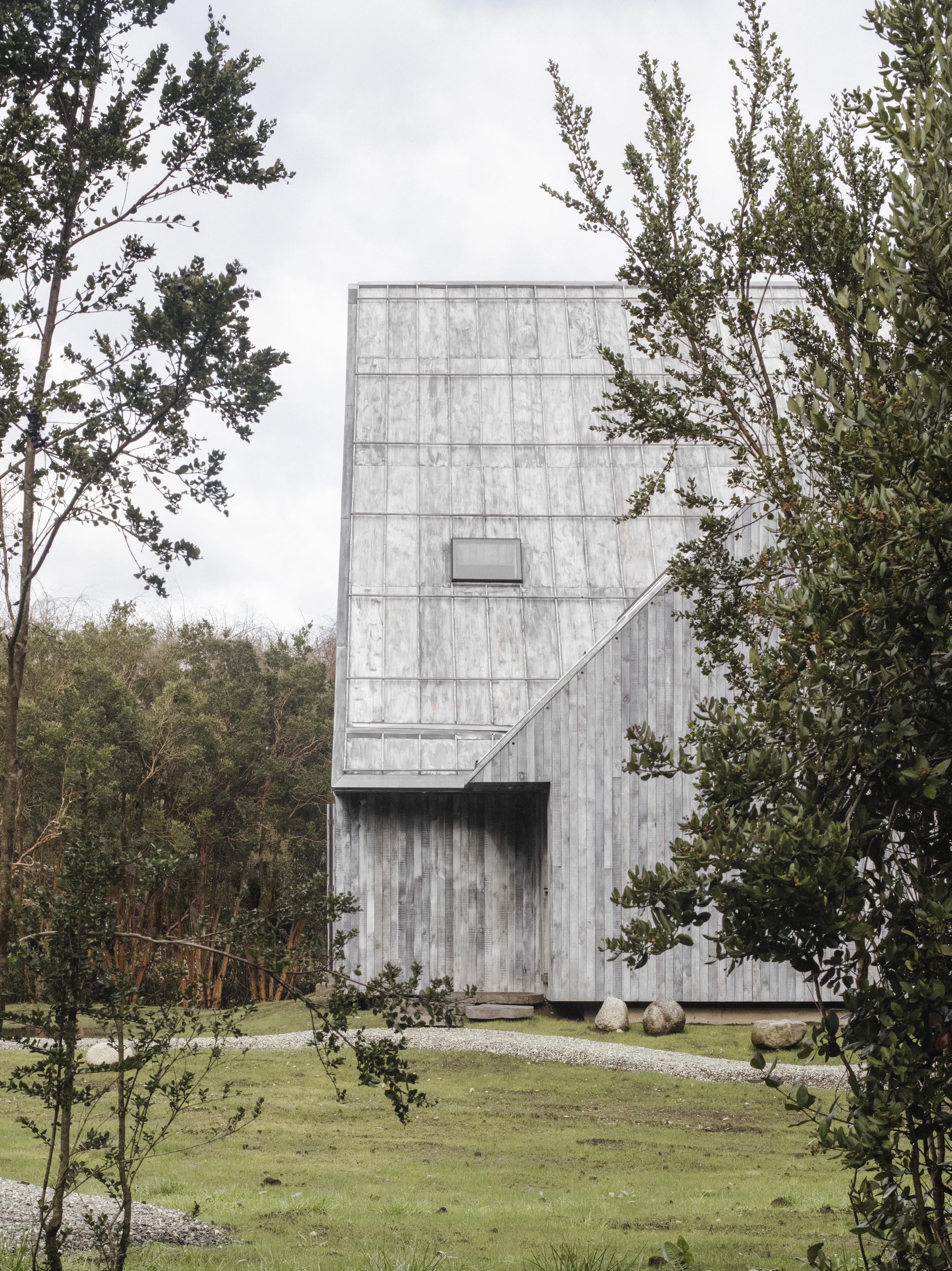 e cobertura se fundem numa superfície contínua. O volume encerra os espaços privados a sul, enquanto abre as áreas comuns a norte. A sua forma compacta e despojada evoca os celeiros tradicionais do sul do Chile, concebidos para a protecção e não para a ornamentação.