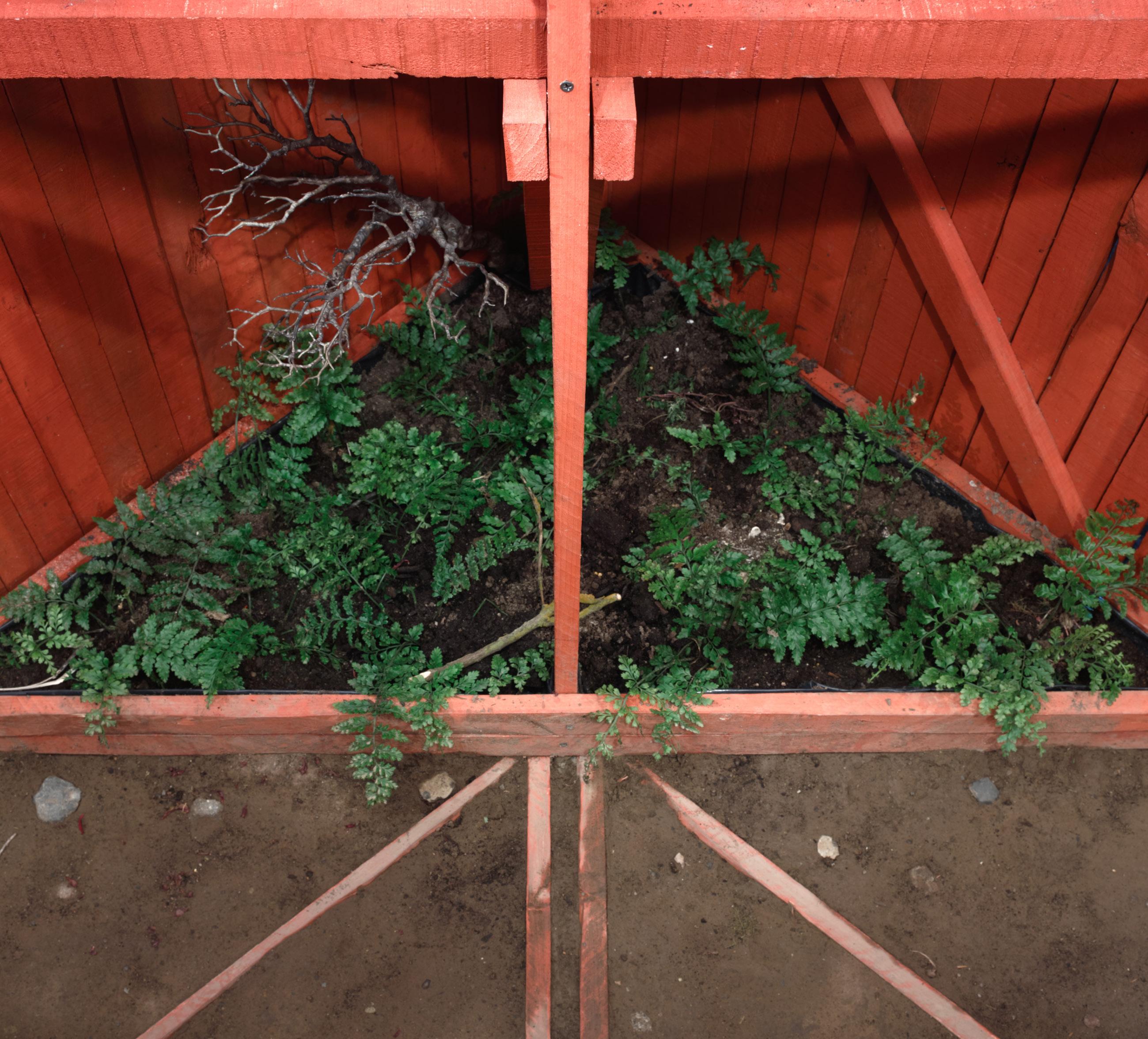 Sobre este interior inclinado, uma grande clarabóia em forma de losango abre-se no cume, deixando entrar a cor do céu e a luz e sombras mutáveis da floresta.