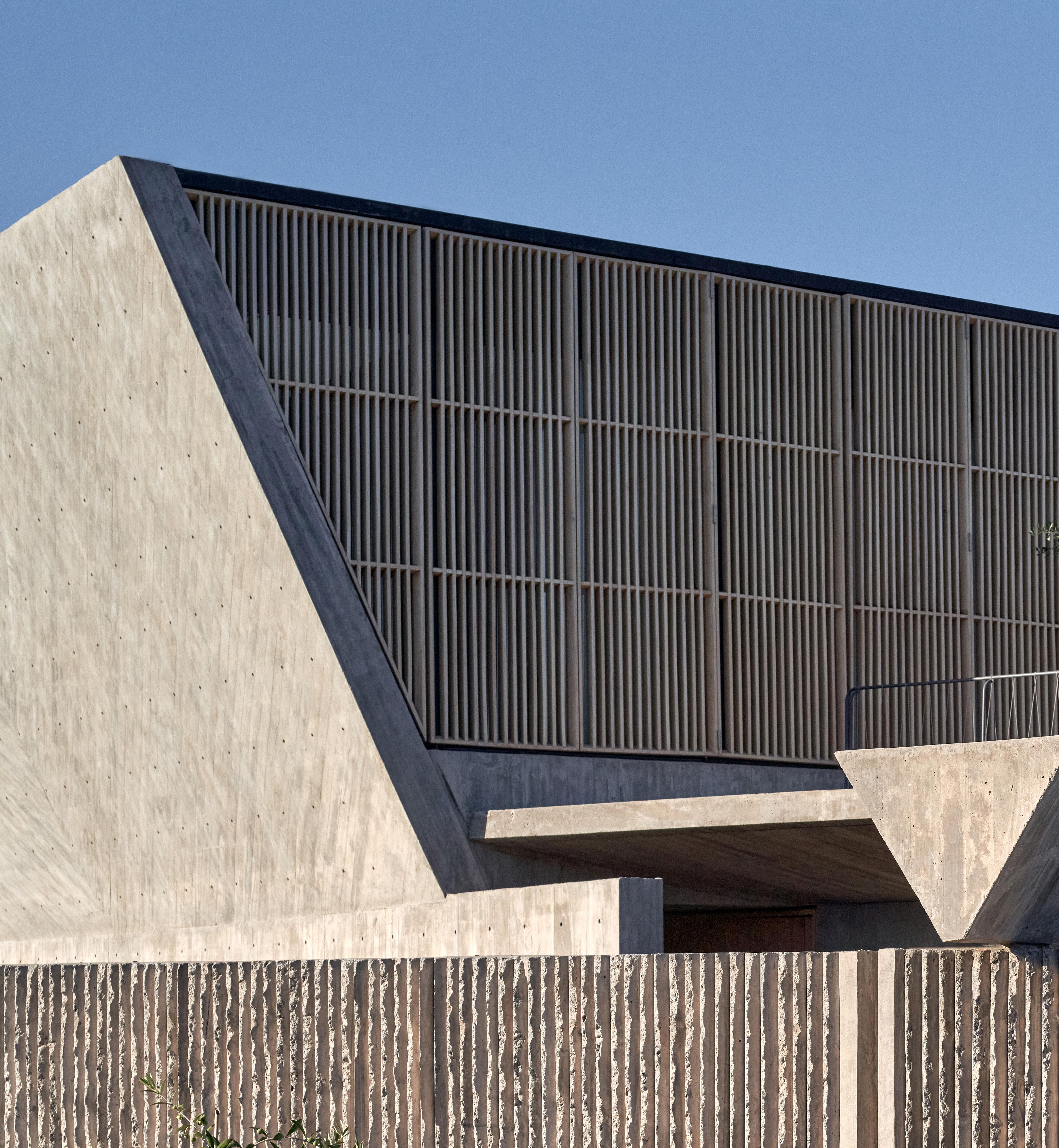 Exteriormente, a volumetria é definida por um único gesto formal: o dobrar da fachada principal com a cobertura, fundindo-as numa forma contínua. Esta operação dissolve a distinção habitual entre paredes e cobertura, unificando o volume. Eixos perpendiculares e oblíquos cruzam-se, orientando a disposição das aberturas, os limites do terreno e os percursos exteriores.