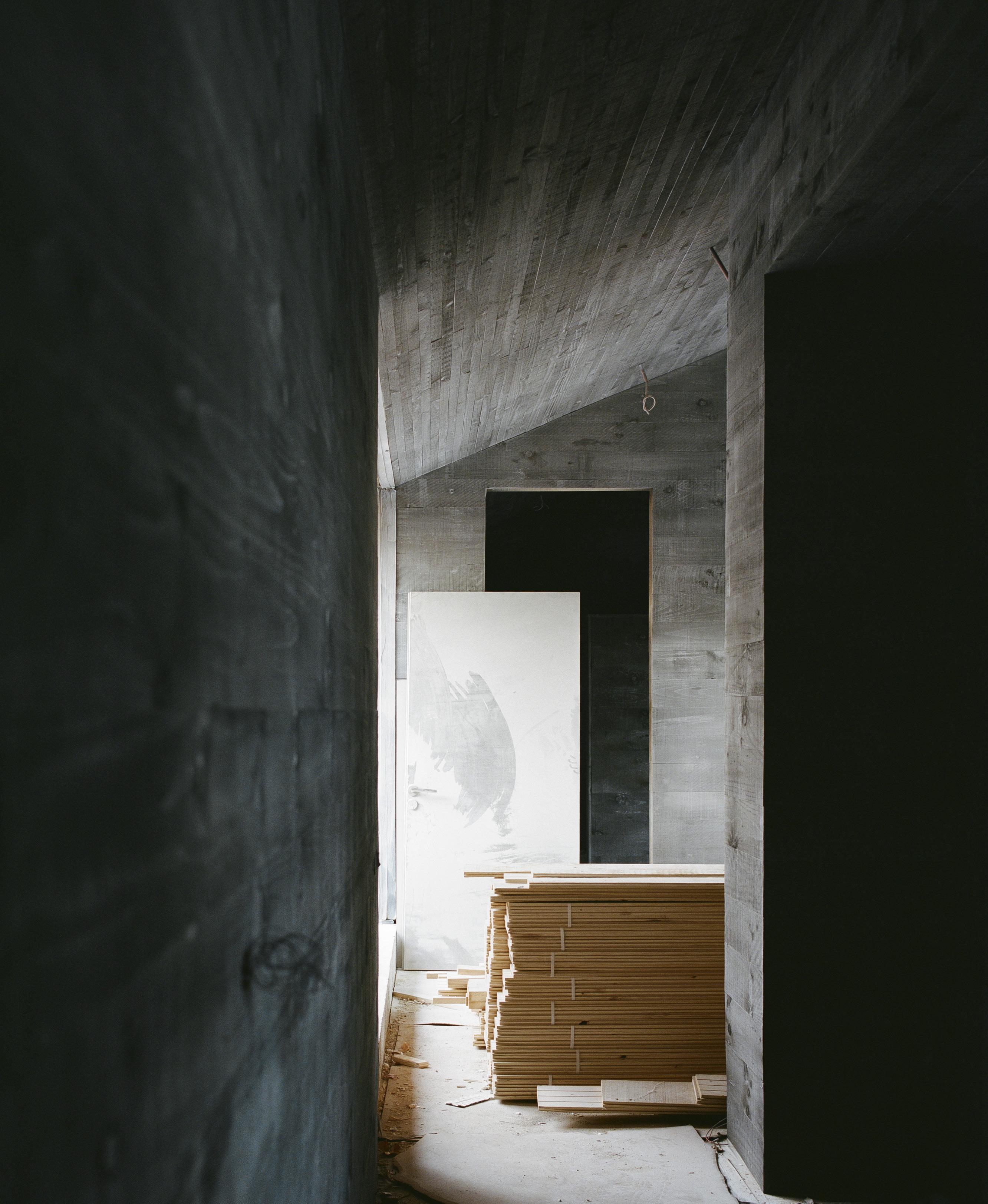 No exterior, o volume com 30 metros de comprimento mantém uma presença silenciosa através de uma fachada neutra e monocromática, com aberturas mínimas, evocando os celeiros tradicionais de revestimento em madeira de lariço da região.