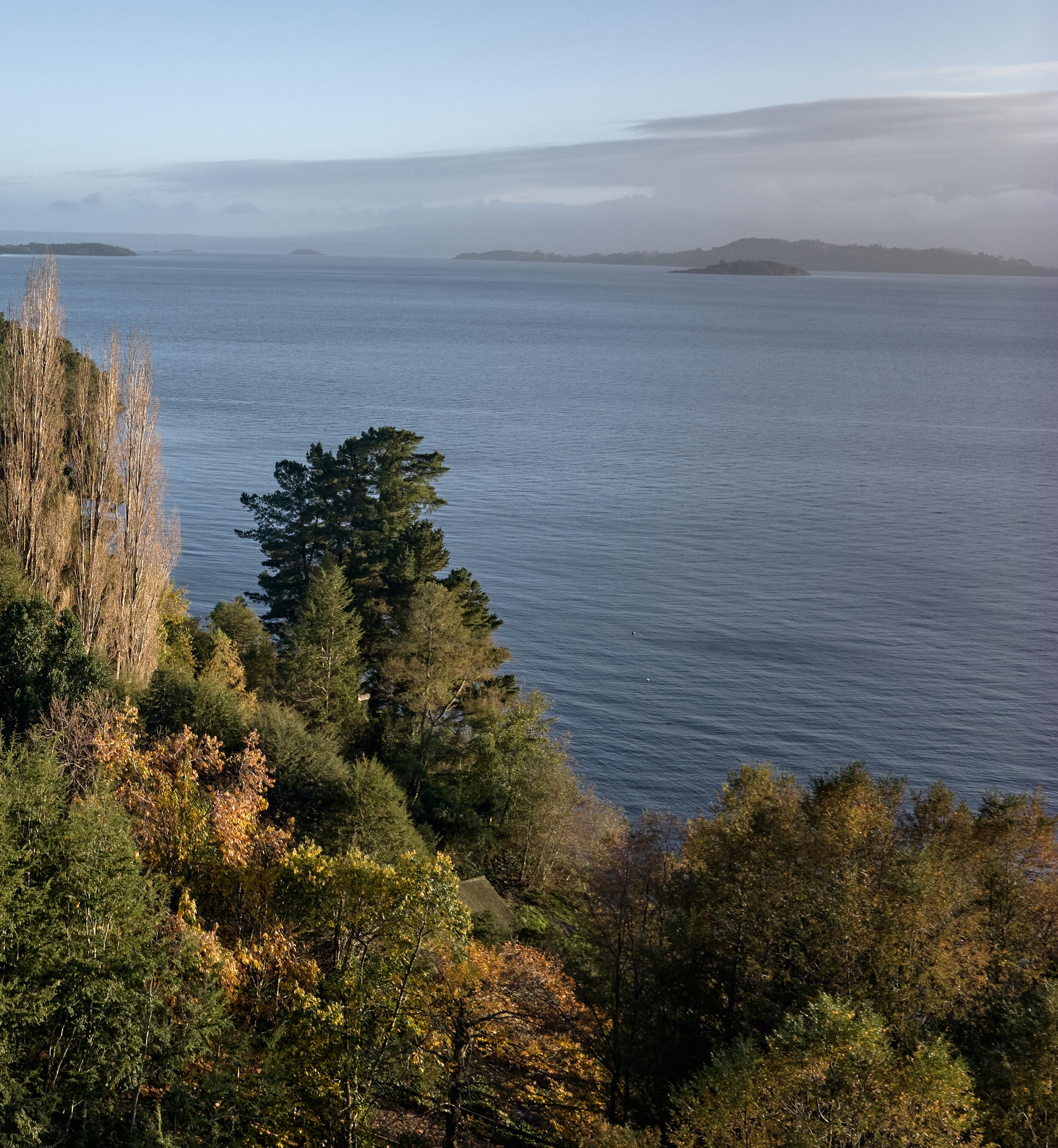 Detached from the main volume, a cylindrical structure contains the wet areas. Here, all services and bathrooms are concentrated, also open to the sky, forming a compact, elemental core. The entire structure, made of laminated pine, was prefabricated with CNC machining 280 km from the site and assembled in just two weeks. The exterior, however, was not fast: it was fully handcrafted on site with shingles of Alerce (Fitzroya cupressoides). This technique — tejueleo — has shaped the technological and cultural landscape of southern Chile since the 17th century. Originating during the early exploitation of Alerce forests