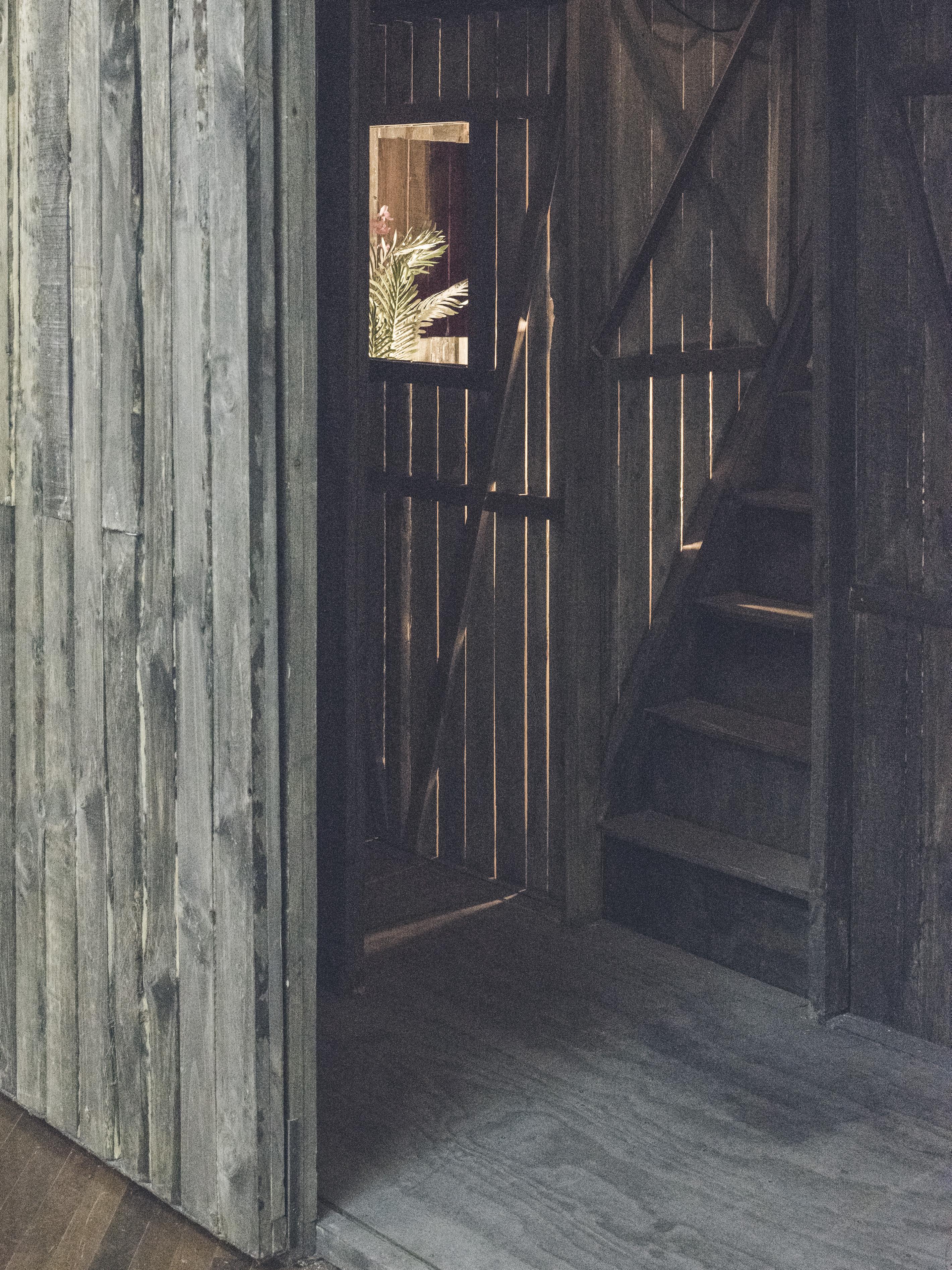 Both interior and exterior are clad in raw timber slats, stained individually to create a rough, weathered appearance that blends into the foggy surroundings.